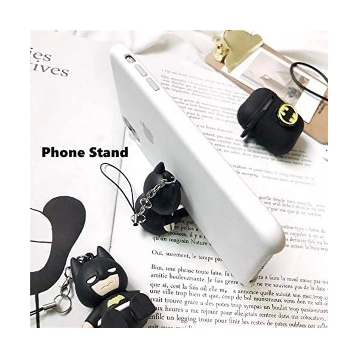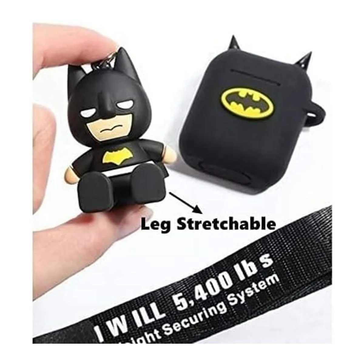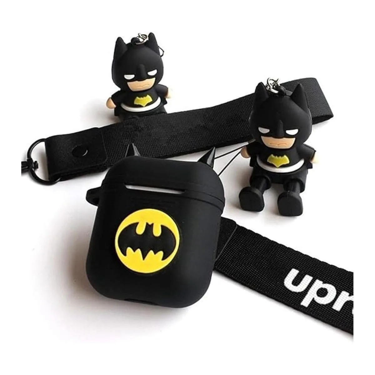 SPEEDYUNI Compatible con Airpods 2 y 1, funda protectora de dibujos animados con cordones de seguridad, llavero y figura de superhéroe 3D negro