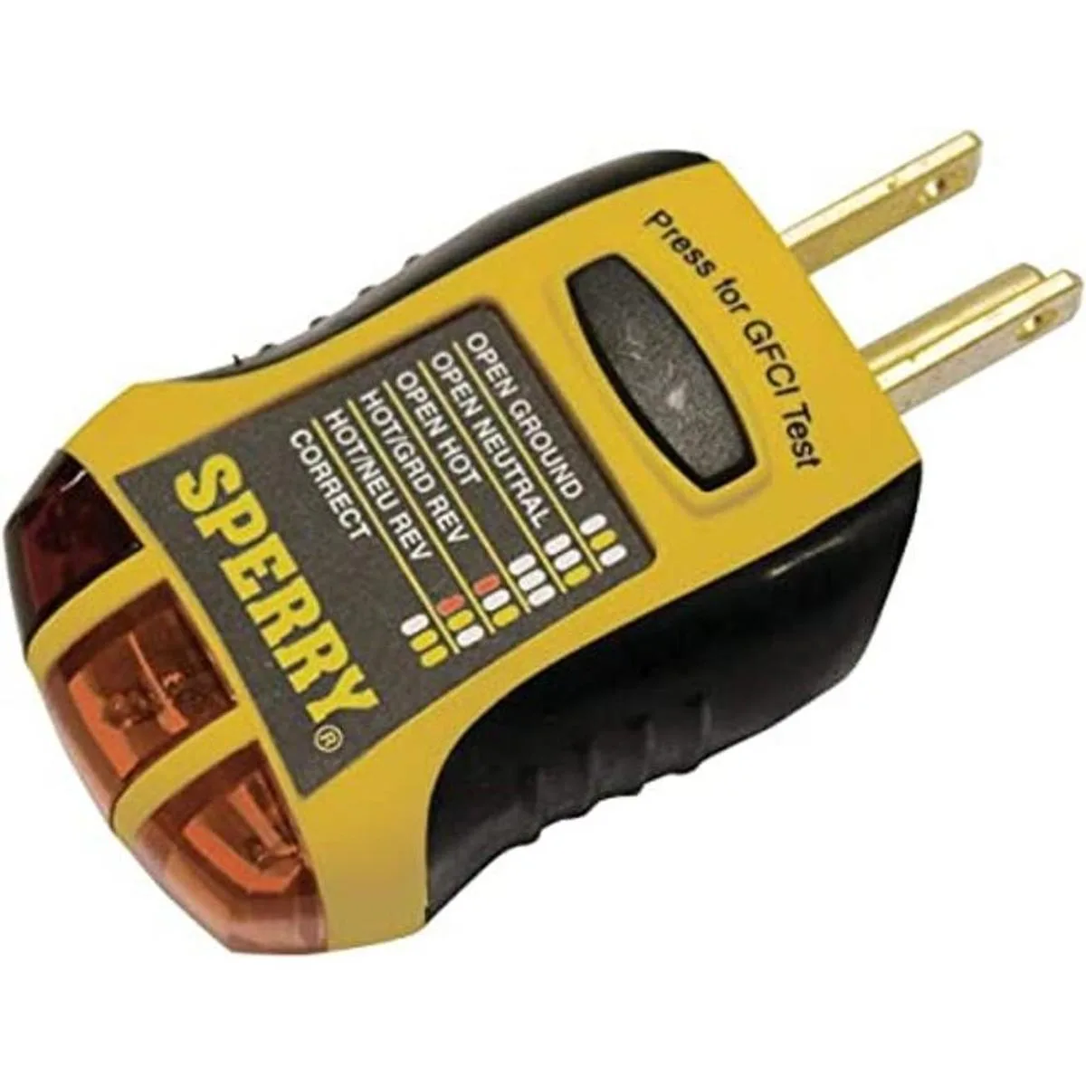 Sperry Instruments Probador de enchufe y receptáculos de interruptor GFCI, salidas de corriente alterna estándar de 120 voltios, 7 indicadores visuales, leyenda de cableado, uso doméstico y profesional, color amarillo y negro GFI6302