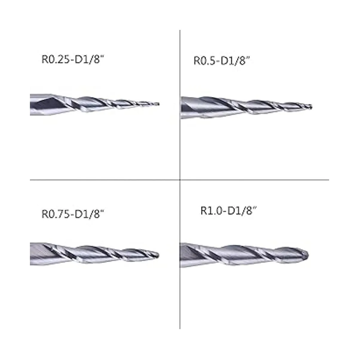 Ball Raidus: 0.25, 0.5, 0.75, 0.039 in, longitud de la flauta: 0.591 in, longitud total: 11/2 pulgadas