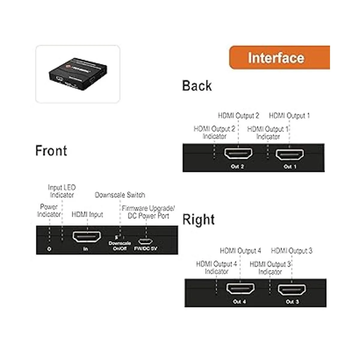 Este asequible divisor HDMI 1 x 4 permite a los usuarios dividir 1 señal de entrada HDMI caja de cable/satélite, reproductor de DVD/Bluray, PC, Apple TV, Roku, Xbox, Fire TV y otros a 4 pantallas de salida HDMI simultáneamente