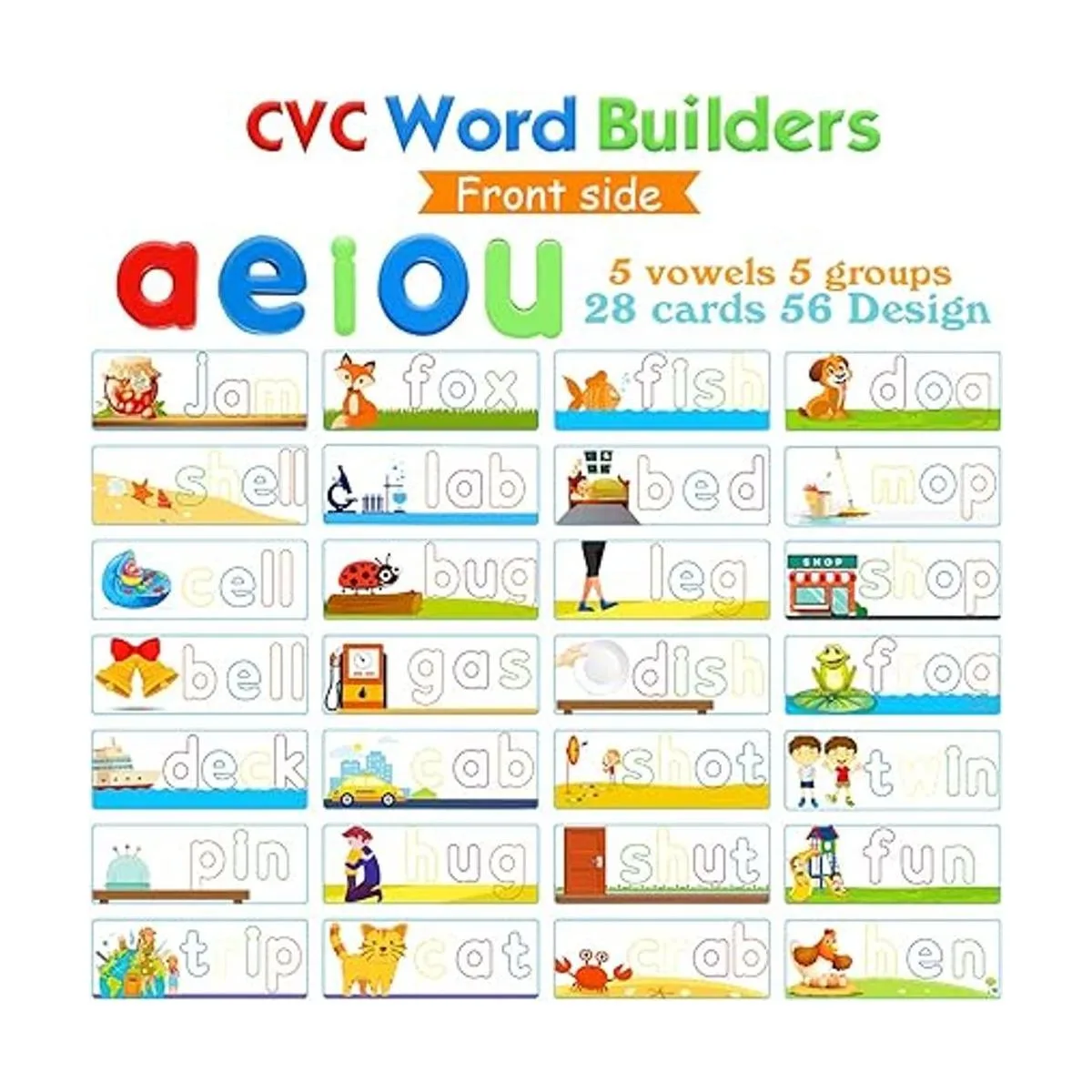 Qué hay dentro 28 tarjetas flash de rompecabezas de letras de doble cara, que proporcionan una gran variedad y palabras importantes CVC. Tamaño 8.27 x 3.15 pulgadas, hechas de cartulina pesada con acabado laminado. 52 bloques de alfabeto de madera resistentes, contienen 26 x 2 letras ABC. Tamaño: 1.42 x 1.26 pulgadas, que es sólido y fácil de maniobrar, incluso para manos pequeñas. 1 bolsa de almacenamiento: ayuda a tus hijos a desarrollar un buen hábito de empacar juguetes. Fácil de viajar y almacenar.