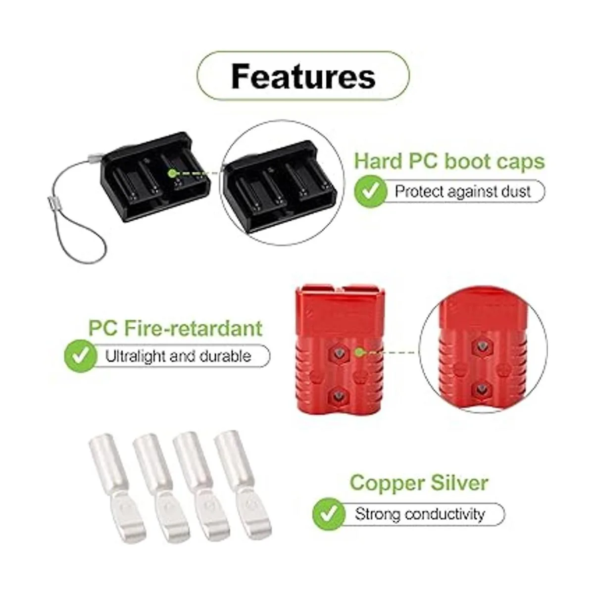 Amplia aplicación: los conectores de batería Spurtar son populares para motores de arrastre y equipos de conexión de batería, así como carga, cabrestantes, carretillas elevadoras, carga de vehículos y mucho más. Disponible en calificaciones de 175 amperios y cable de batería de calibre 1/0 para satisfacer tus necesidades, ideal para horquillas de palé de conexión rápida también
