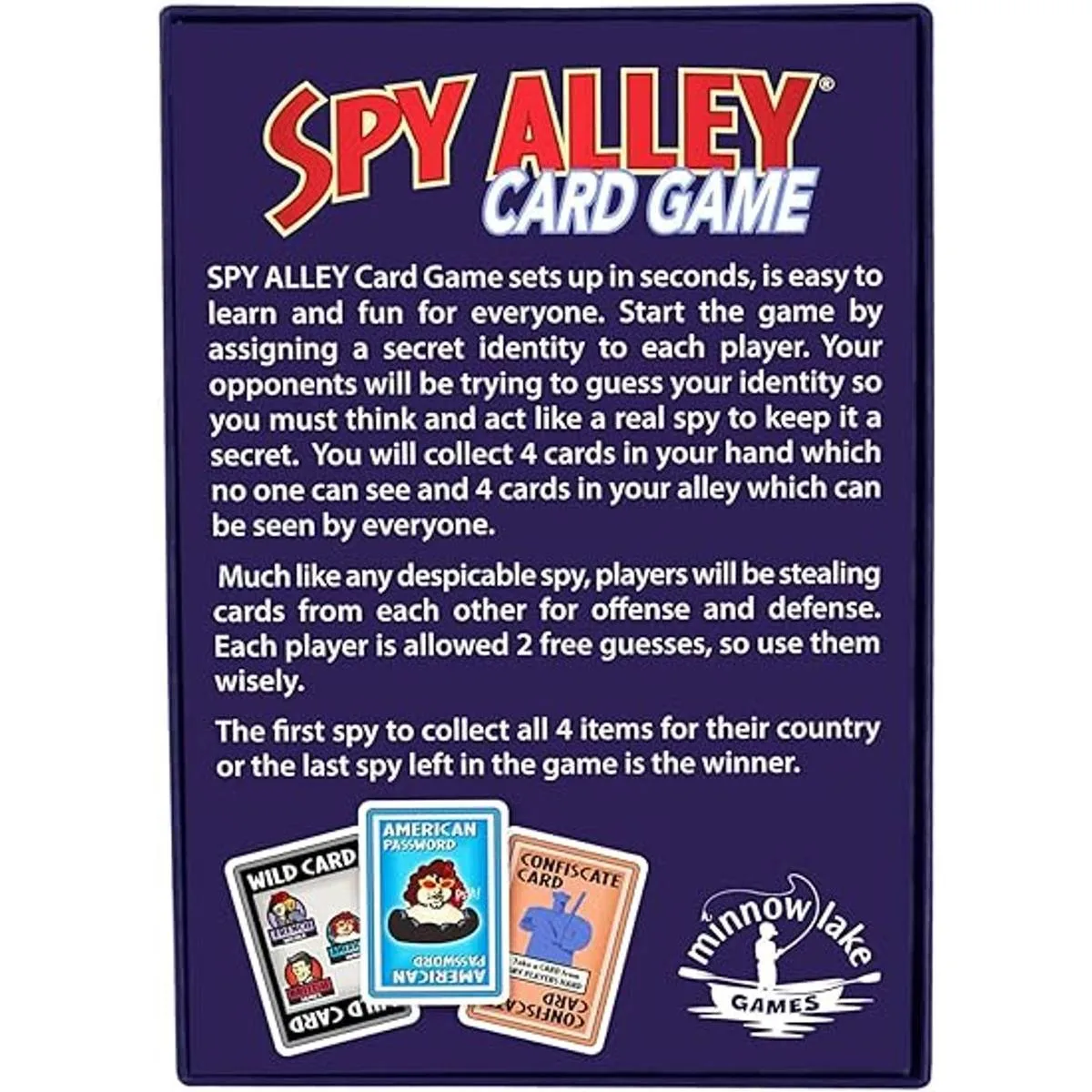 YOUR MISSION The goal of the Spy Alley Card Game is to conceal your identity and outwit your opponents. Collect your spy equipment/documents before your opponents reveal your hidden identity, all the while trying to unmask your opponents. Be careful A small gesture, a slight hesitation, or slip of the tongue, are all easy ways for your friends and family to oust your country and knock you out of the game
