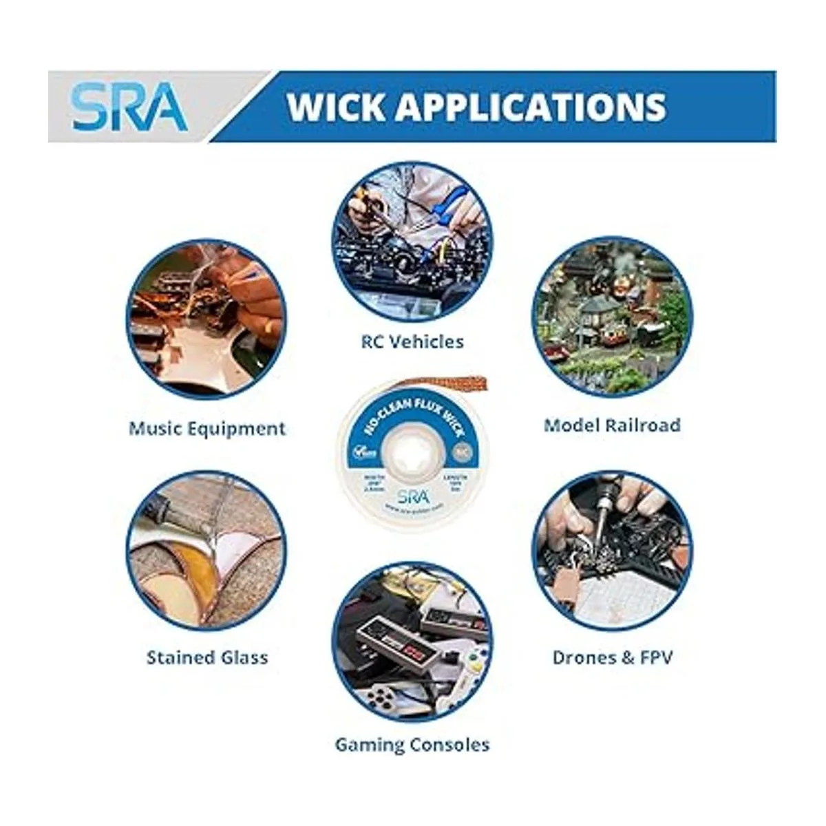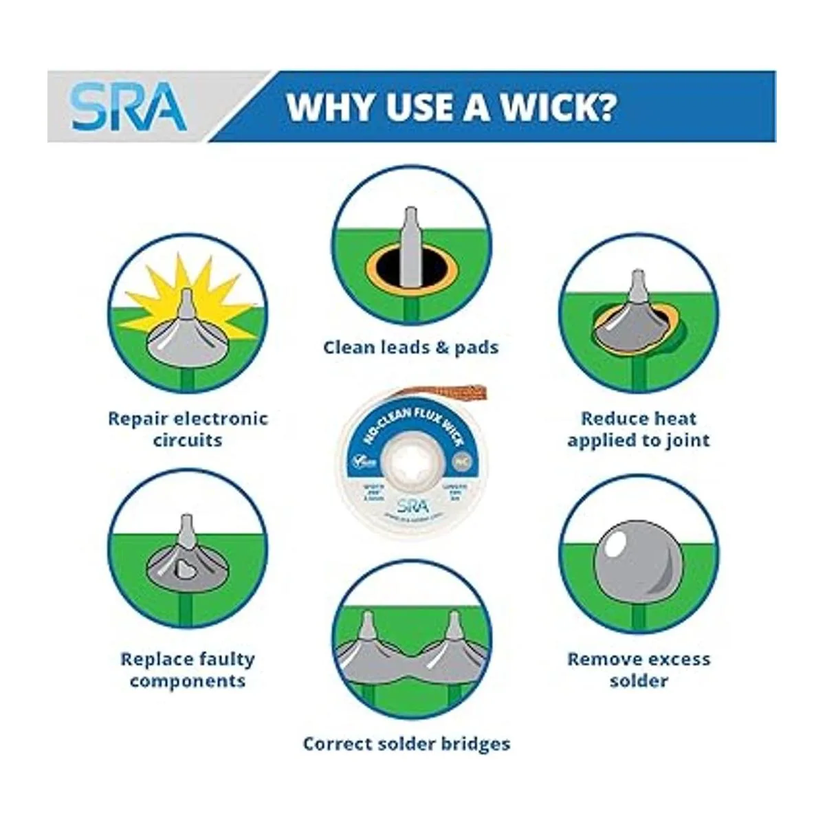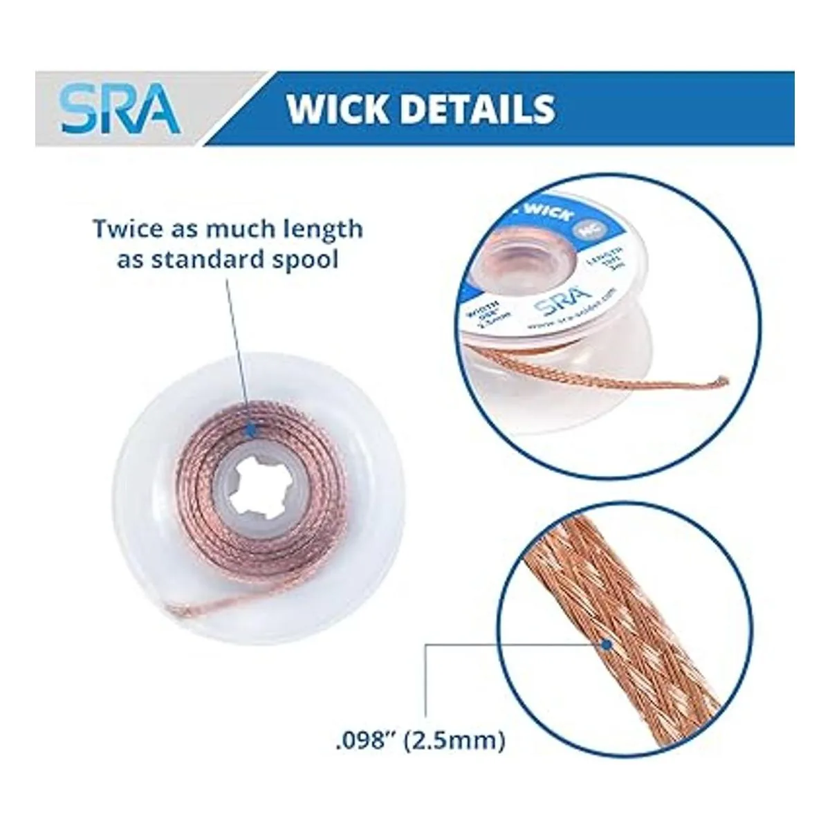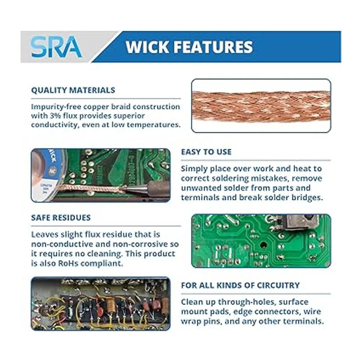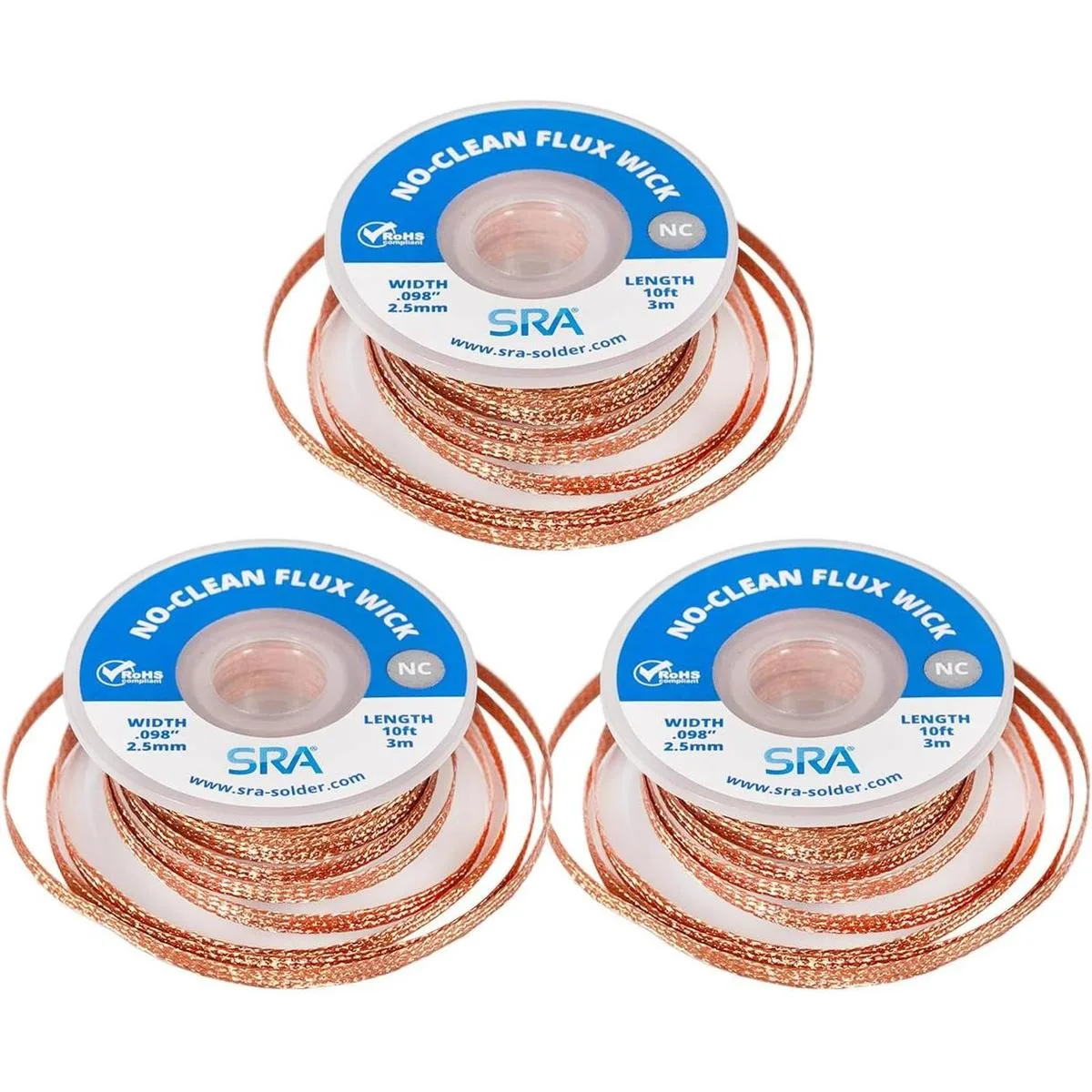 SRA Mecha de soldadura con tira trenzada de cobre tejida plana y sin flujo de limpieza para una fácil eliminación de soldadura sin daños, paquete de 3 carretes de mecha de soldadura de 10 pies
