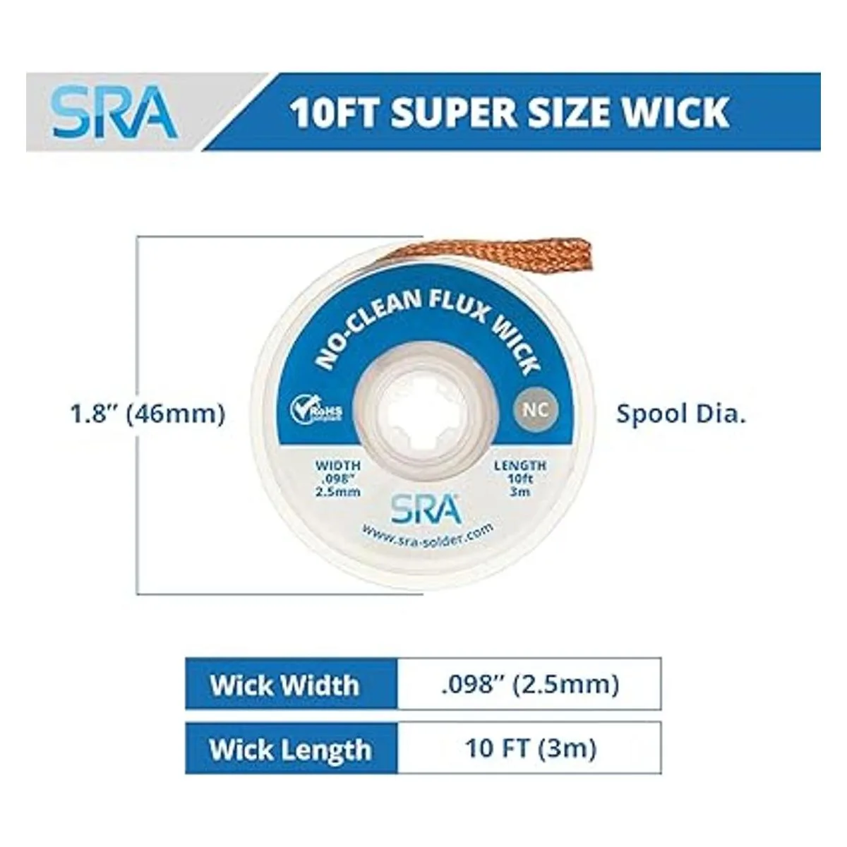 Carretes de desoldadura de gran tamaño de 10 pies: 30 pies de ancho estándar .098 pulgadas de mecha desoldadora impregnada con flujo sin limpieza para una acción rápida y eficiente de absorción de soldadura.