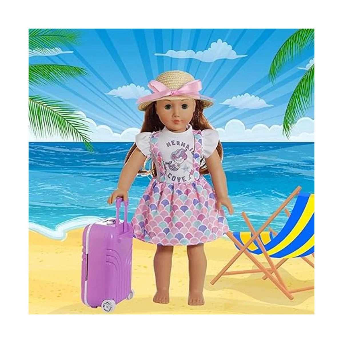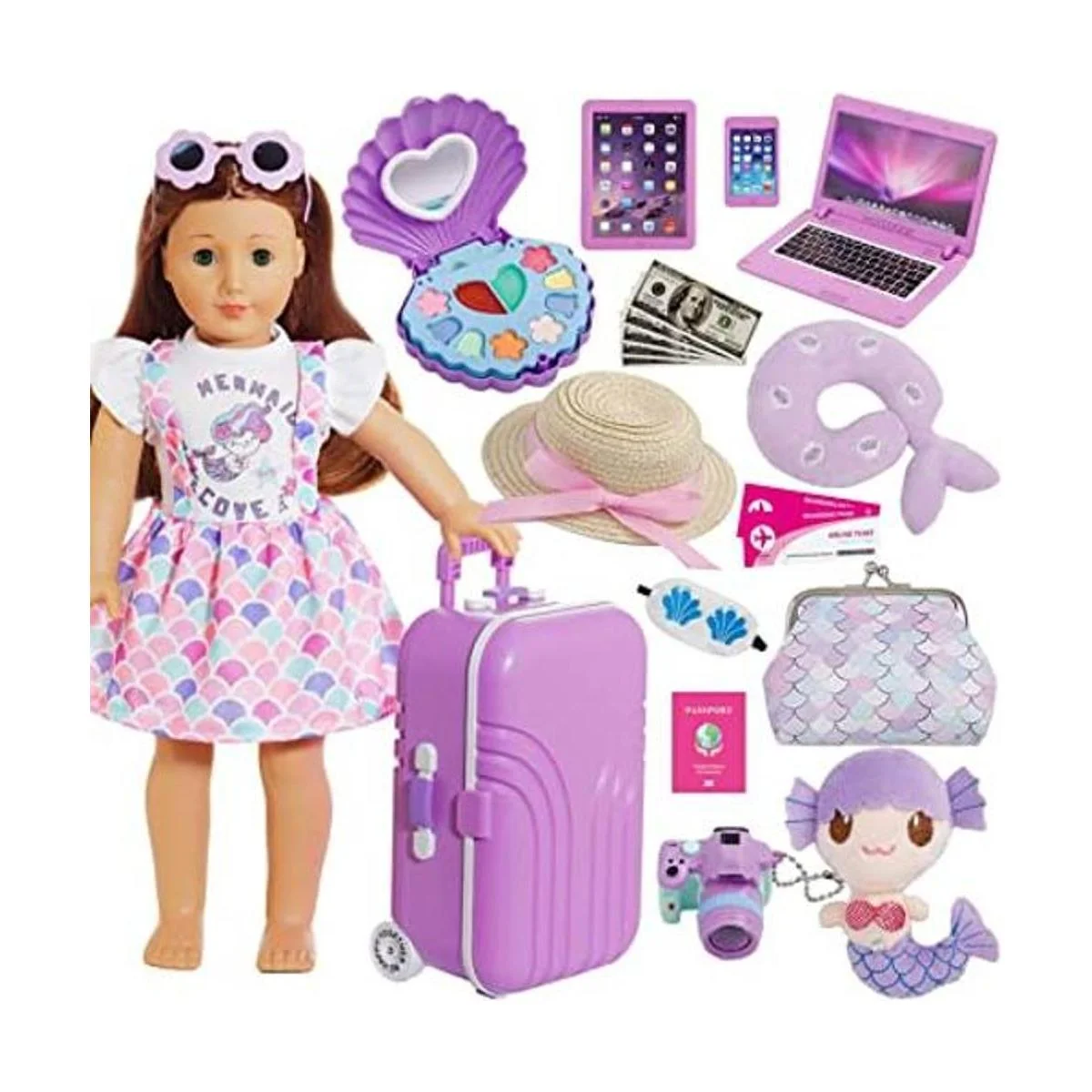 Srua Don American Maleta de muñeca de 18 pulgadas, juego de equipaje de viaje, diseño de sirena de 18 pulgadas, accesorios de almacenamiento, incluye funda para muñeca, sombrero, gafas de sol, cámara, almohada, juguete, mascota, etc