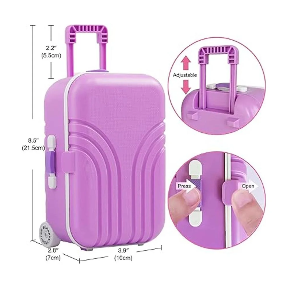 Increíble experiencia de viaje: funda de viaje para muñecas americanas con un tamaño de aproximadamente 6.7 x 4.3 x 3.2 pulgadas, puede acomodar bien algunos accesorios. Nuestra maleta de muñecas tiene cuatro ruedas giratorias, lo que la hace más realista. El mango ajustable puede moverse hacia arriba y hacia abajo. Tu hijo puede simular viajar junto con sus muñecas, ya sea al aire libre o en interiores