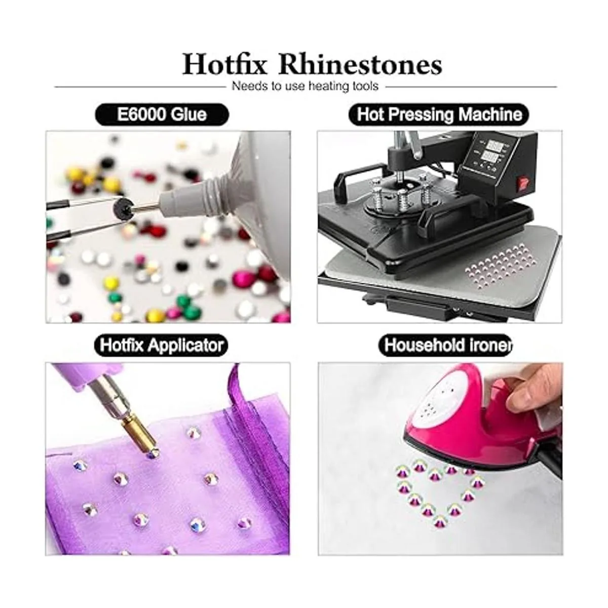 Utiliza pinzas y recogedor de gemas para recoger diamantes de imitación, aplicador Hotfix o plancha doméstica, máquina de prensa de calor para reparación de calor y fijación, después de que el pegamento activado por calor se derrita, pega en el objeto y presiona ligeramente los diamantes de imitación durante unos 5 segundos. También se puede pegar con pegamento E6000.