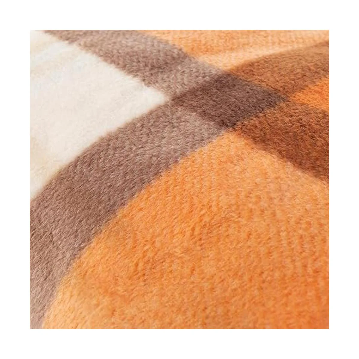 : Material: forro polar antipelusas. Dimensiones: 59 pulgadas de largo x 43 pulgadas de ancho. Longitud del cable: 96 pulgadas. Cuidado: solo limpieza localizada, no lavar a máquina. Incluye estuche de almacenamiento con asas. Color: cuadros naranja.