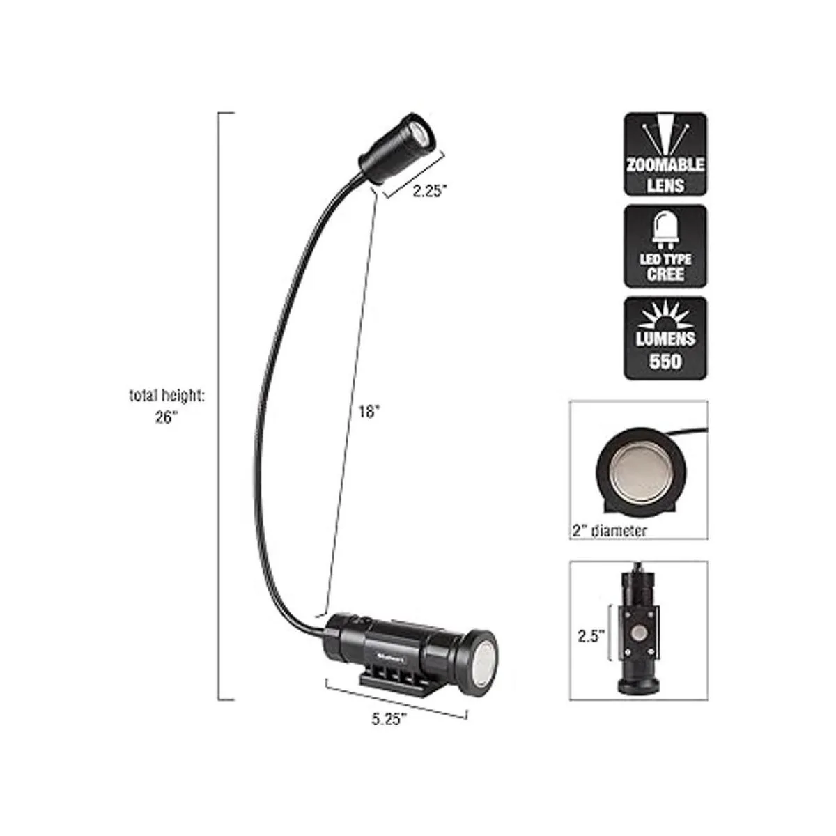 : Dimensiones: 26 pulgadas altura total 0.2 pulgadas ancho de la base. Dimensiones del imán: imán circular: 2.0 in de diámetro, imán cuadrado 2.5 in altura. Brillo: 550 lúmenes. Tipo de bombilla: LED CREE. Funciona con 3 pilas AA no incluidas. Color: negro
