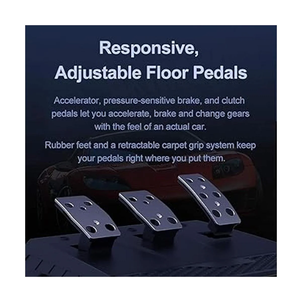 Pedales con embrague: la rueda de carreras V9 tiene pedales sensibles a la presión, puede simular coches de carreras reales. Los pedales tienen pies de goma y un sistema de agarre retráctil para alfombras que mantiene tus pedales firmemente en el suelo y no se volcarán cuando pedaleas.
