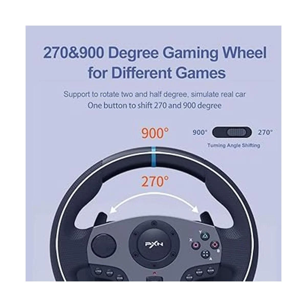 270 y 900 grados Un botón para cambiar entre 270 y 900; 900 es adecuado para jugar juegos de camiones, como simulador de camiones europeos, simulador de camiones americanos, 270 es adecuado para jugar juegos de carreras, como Need for Speed, Forza Horizon.