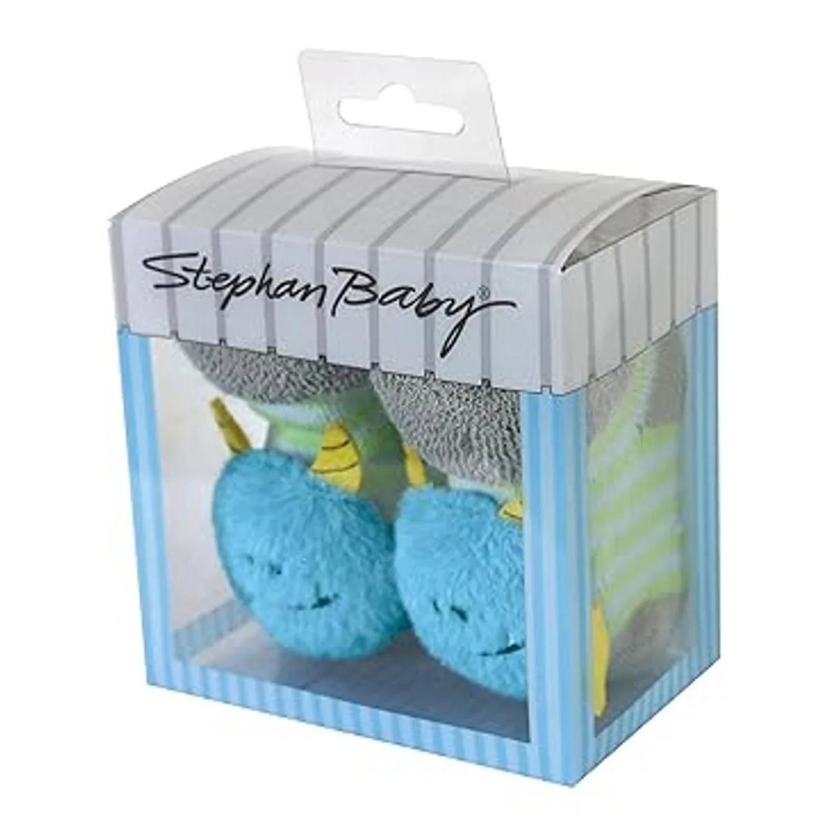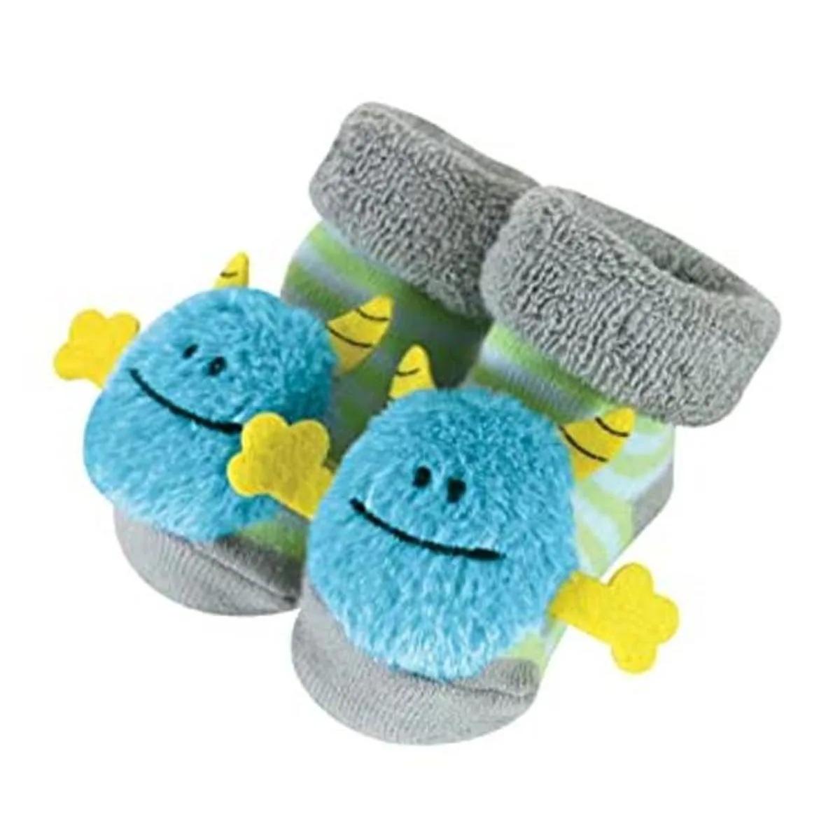 Blue monster rattle socks are delightfully entertaining and sized to fit little ones 3 to 12 months of age