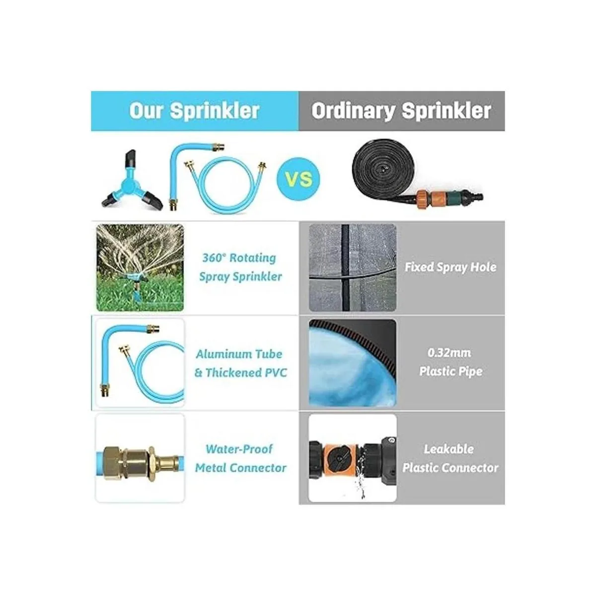 Larga vida útil: la manguera corta de cobre y la manguera larga de PVC pueden soportar mucho plegado y flexión. Los aspersores de plástico ordinarios se pueden romper fácilmente con bridas de cremallera o presión de agua, lo que no es seguro ni práctico. Nuestros aspersores de cama elástica de rotación utilizan materiales de alta calidad y tubos y juntas gruesas para garantizar que no se rompan mientras te permiten usarlos año tras año. No necesitas comprar uno nuevo cada año, esta será una opción perfecta.