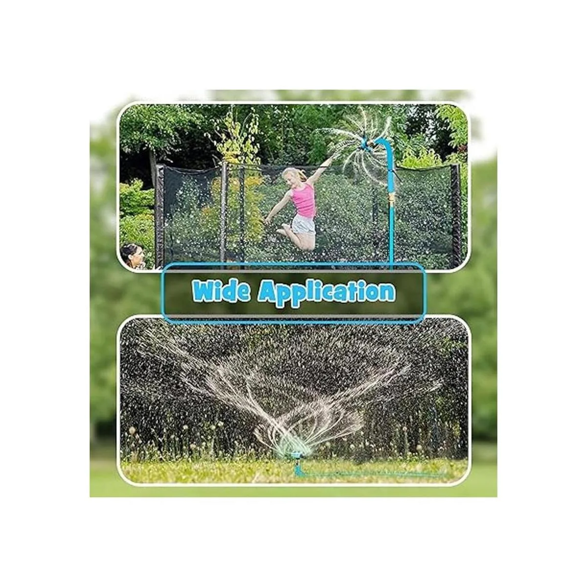 Aspersor giratorio de 360: varillas giratorias de 360 y 12 agujeros de pulverización con ángulos ajustables. El chorro de agua rociado por el aspersor de cama elástica puede cubrir cada esquina de una cama elástica de 30 pies de diámetro. La niebla dinámica de agua convierte la cama elástica en un divertido parque acuático. No solo para que los niños jueguen, sino que también pueden lavar el coche, bañar a la mascota, regar las plantas o limpiar las ventanas.