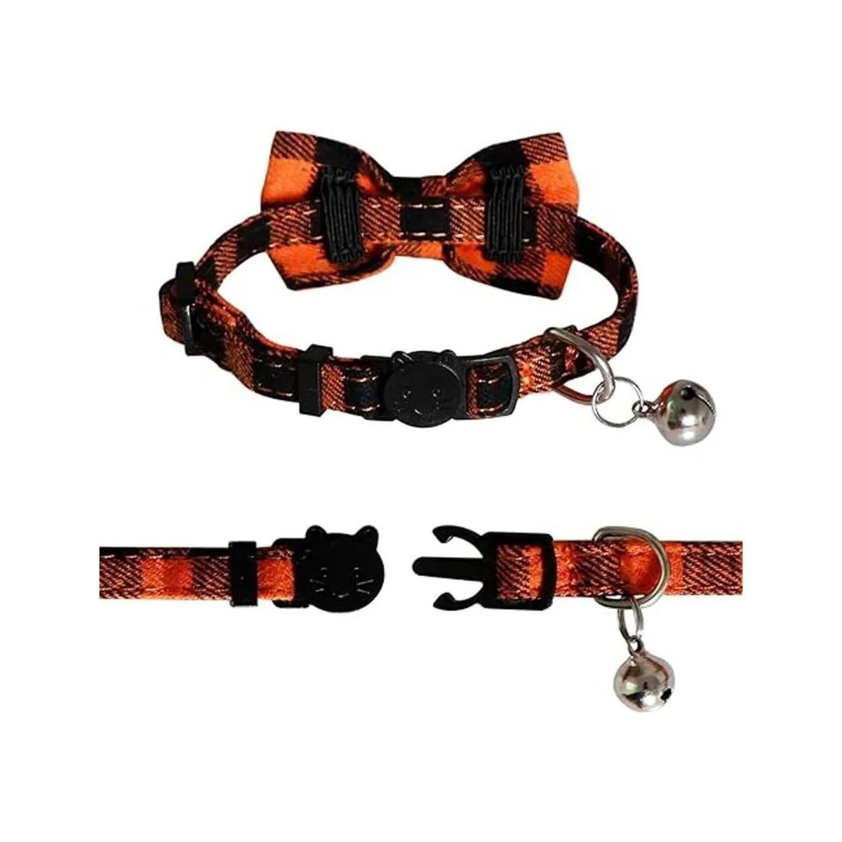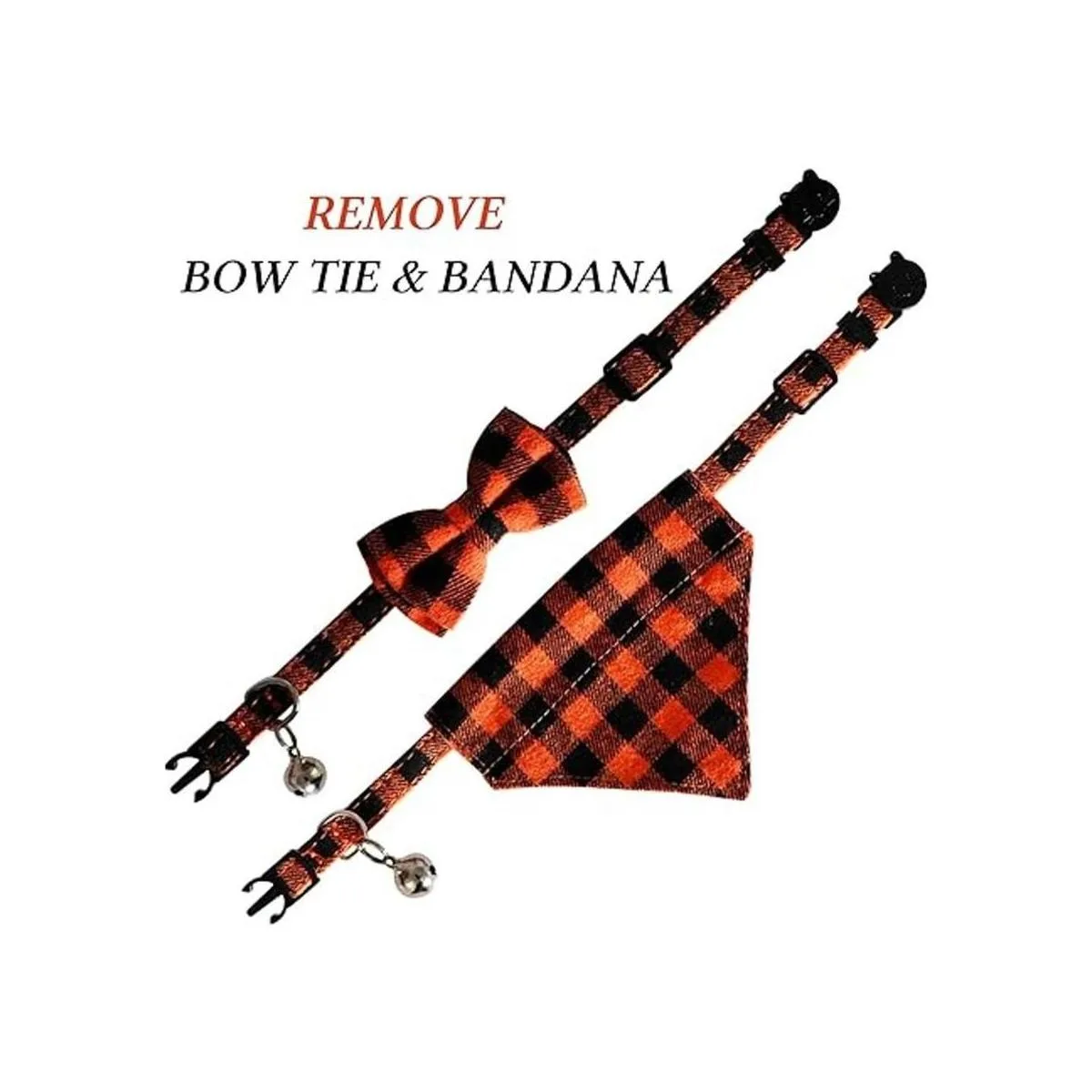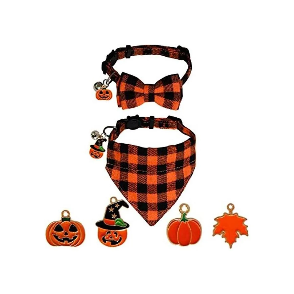 Collares de gato navideño: el paquete contiene un collar de gato de Halloween con pajarita y campana, un collar de bandana para gato del día de Acción de Gracias con campana y 4 adornos de elementos navideños. El collar de gato con campana está diseñado con patrón de cuadros de Halloween y día de Acción de Gracias, único y moderno. Los bonitos collares de gato hacen que tu gato sea encantador en fiestas de vacaciones.