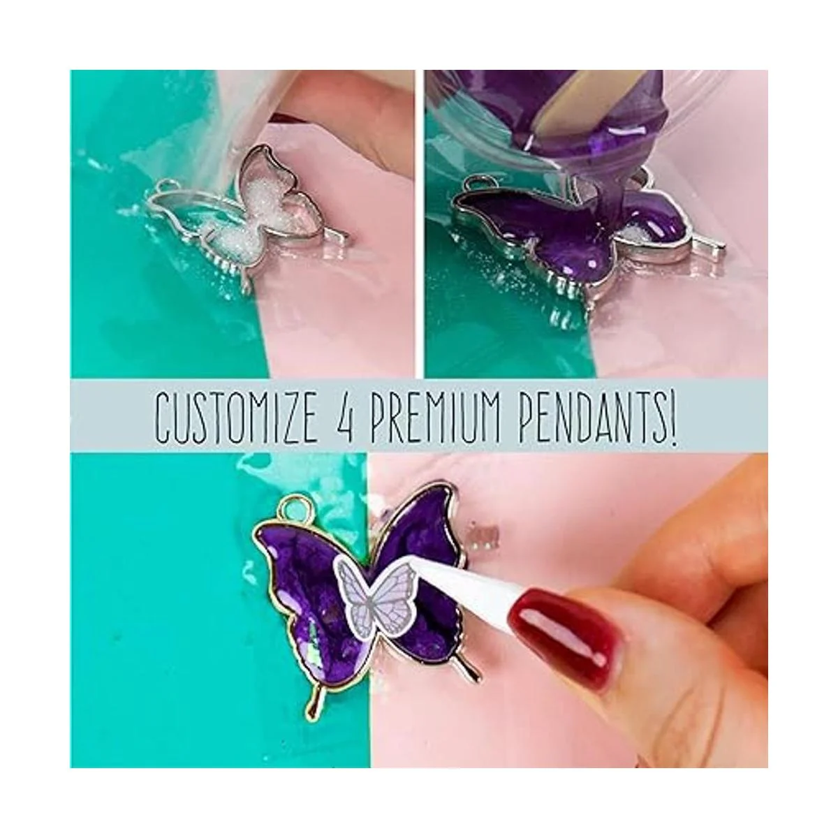 Materiales para hacer joyas de alta calidad: mariposa, estrella, unicornio, corazón: este juego incluye 4 biseles de metal para que puedas llenar con cualquier combinación de colores y accesorios de resina, además de cadenas de primera calidad, cierres de mosquetón y anillos de salto para crear tus propios collares