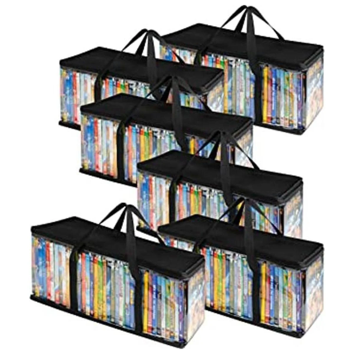 Stock Your Home Bolsas de almacenamiento de DVD juego de 6 bolsas organizadoras multimedia para DVD, CD, discos Blu Ray, fundas de películas, caja VHS, discos de videojuegos, soportes de plástico transparente con asas de transporte y cremallera, color negro