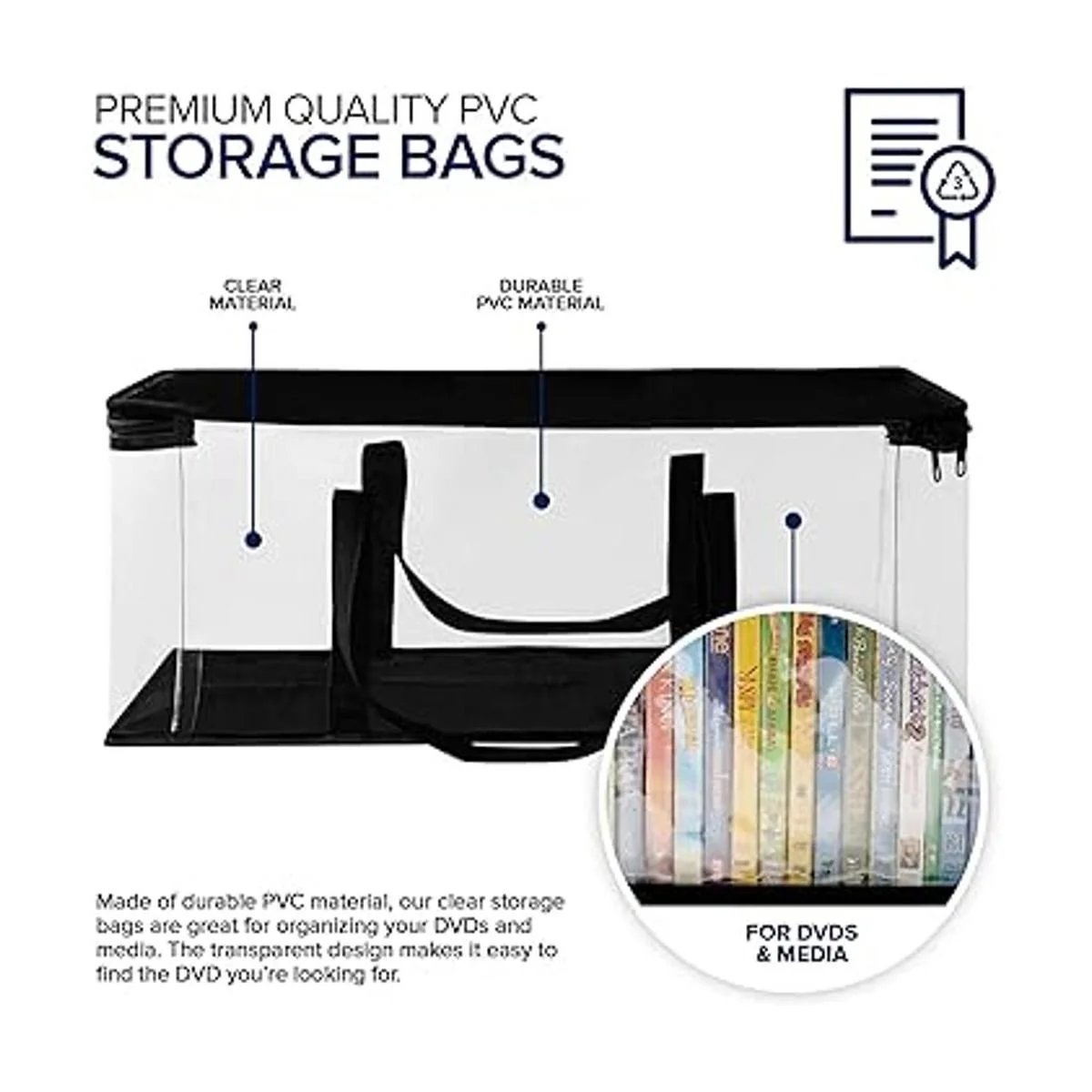 Stock Your Home Bolsas de almacenamiento de DVD (juego de 6) bolsas organizadoras multimedia para DVD, CD, discos Blu Ray, fundas de películas, caja VHS, discos de videojuegos, soportes de plástico transparente con asas de transporte y cremallera, color negro