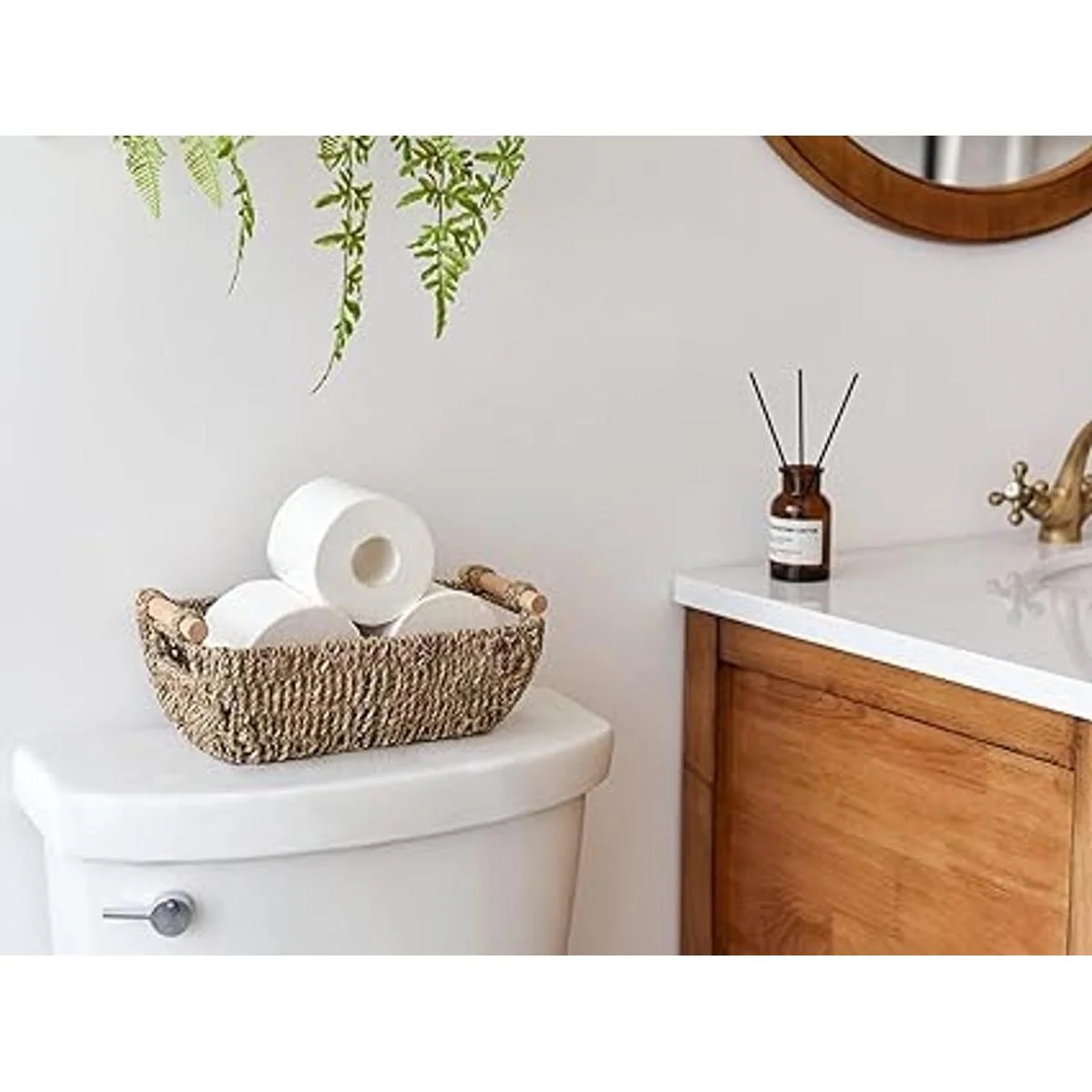 Cesta de papel higiénico con 2 asas de madera para un transporte seguro y fácil.