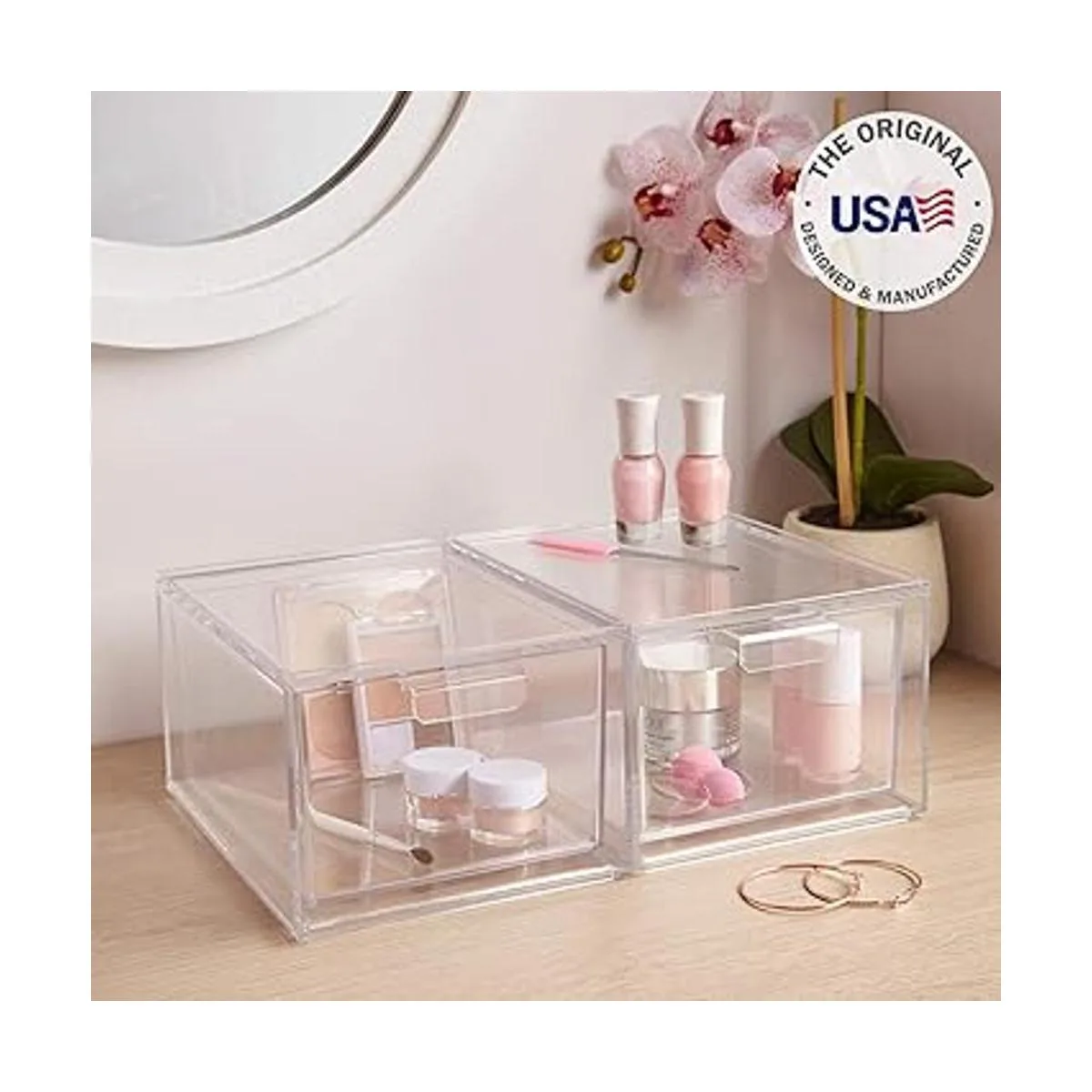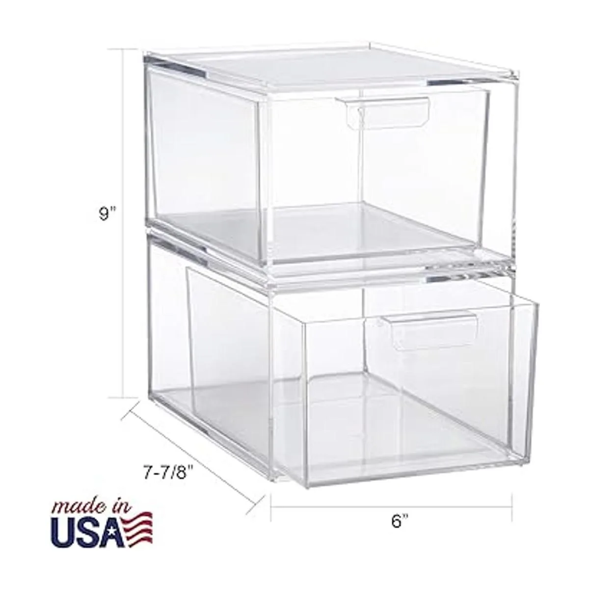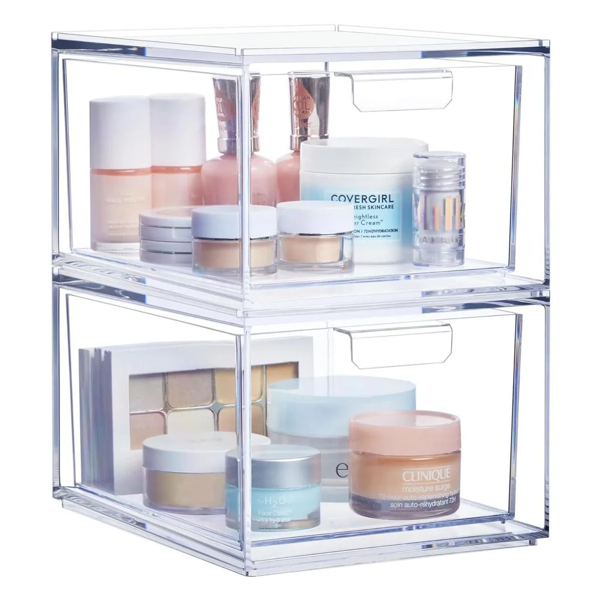 STORi Audrey Cajones organizadores apilables de plástico transparente Juego de 2 piezas 4.5 pulgadas de alto Organiza cosméticos y suministros de belleza en un tocador Fabricado en Estados Unidos