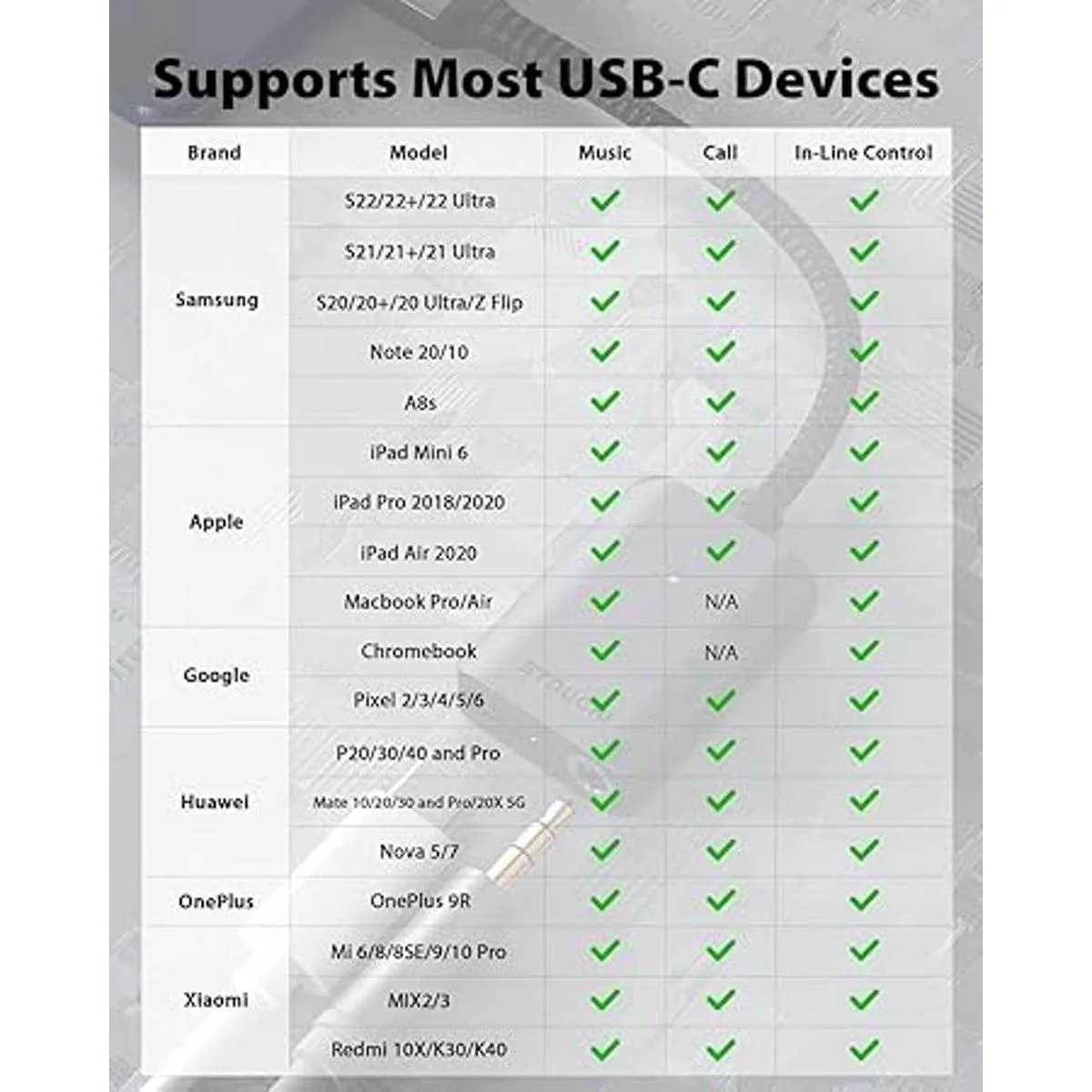 Diseño simple 2 en 1: profesionalmente diseñado para cargar y escuchar música con auriculares de 0.138 in al mismo tiempo. Simplemente enchufa y usa para tu nuevo teléfono inteligente USB C y tableta.