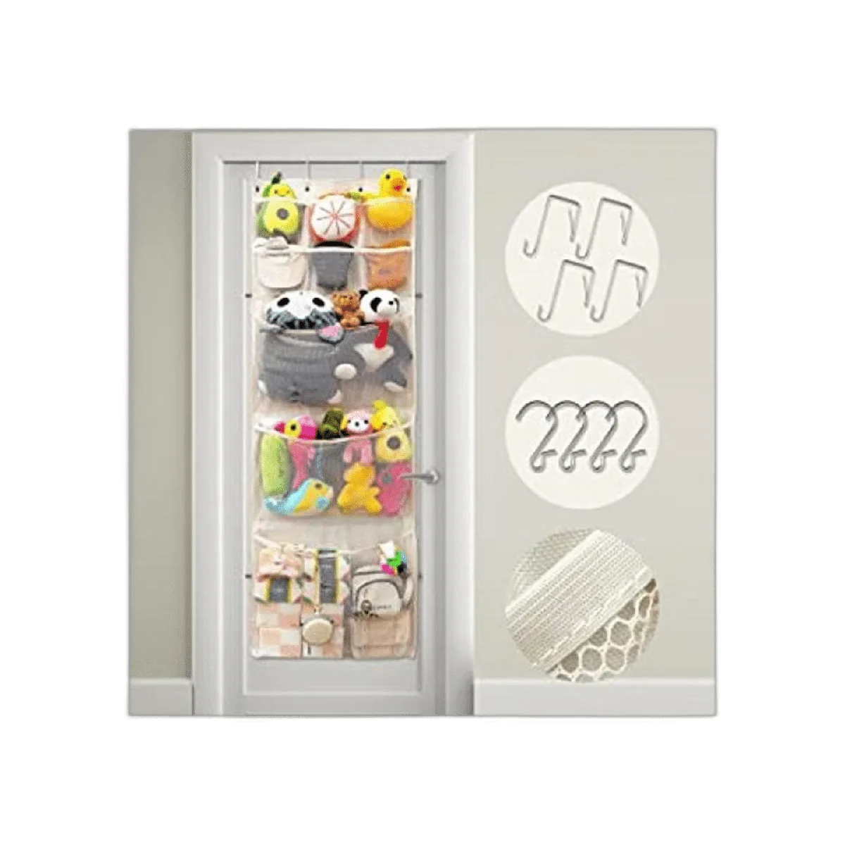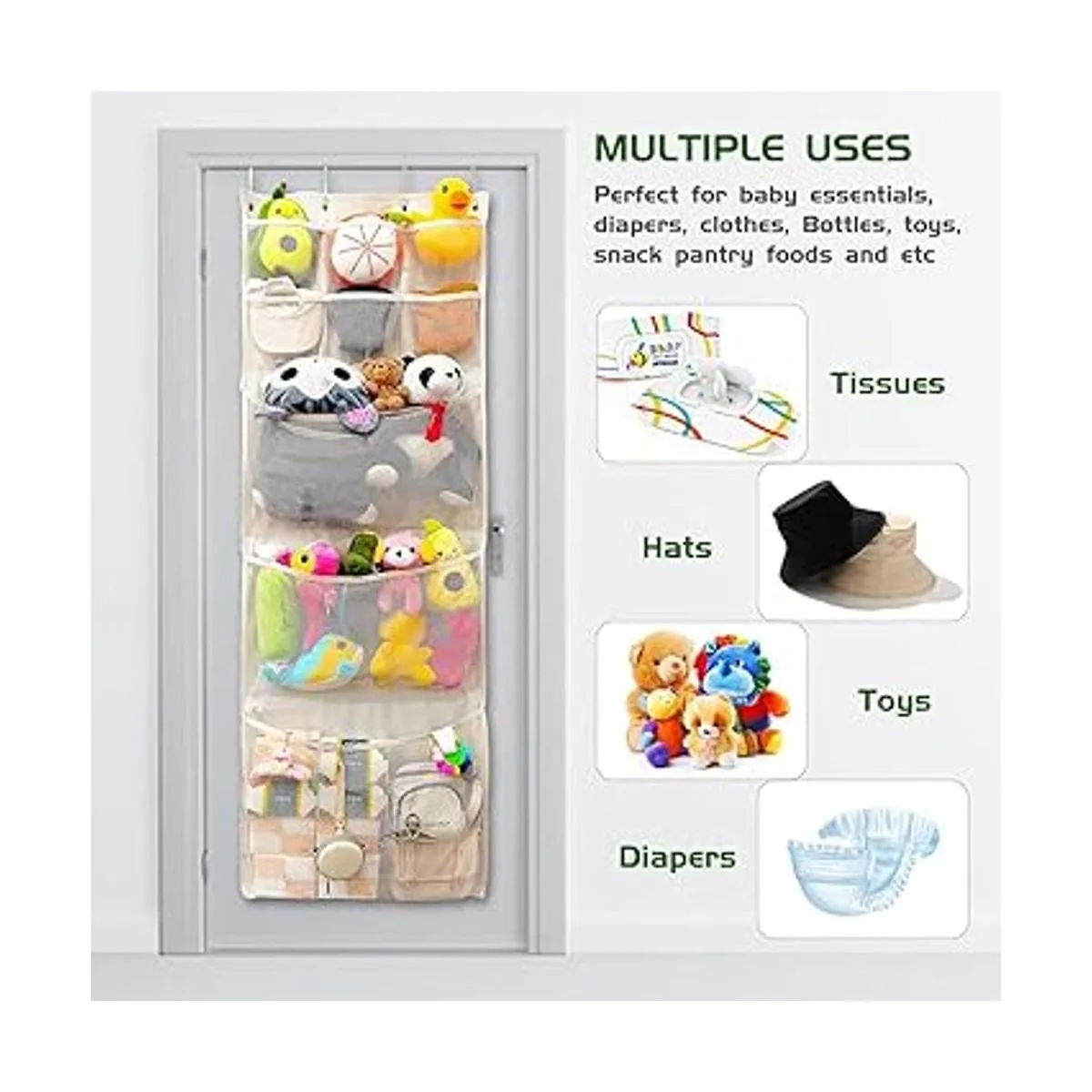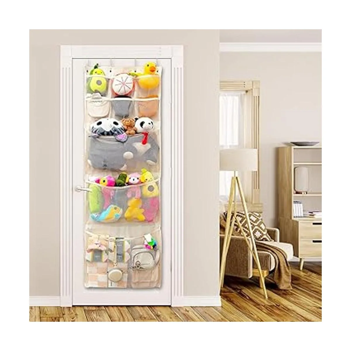 3 LARGE POCKETS 6 SMALL POCKETS The storage for stuffed animal has 3 large mesh pocket and 6 small storage net pockets. Total kid stuffed animal organizer measures: 63.822.8 inch. Over door organizer for stuffies provides enough capacity for storing lots of toys. Whats more, kids can get and put their toys easily. Keep your room tidy and clean