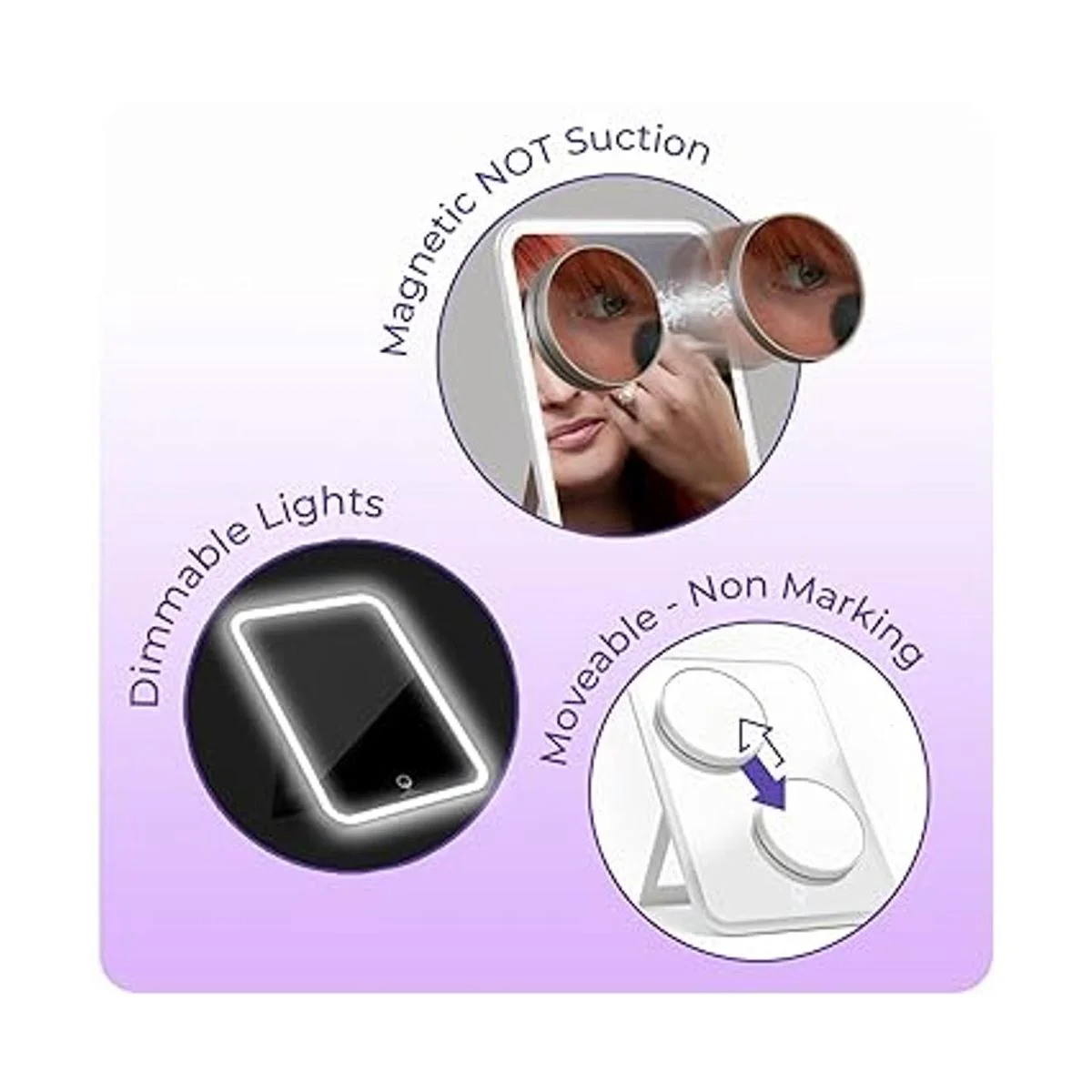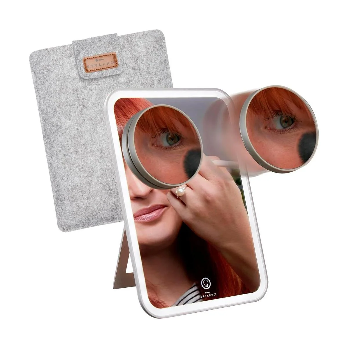 STYLPRO Espejo de tocador de maquillaje con espejo magnético de aumento de 10 x, recargable, luces regulables, soporte ajustable, estuche de viaje de lujo suave y cable de carga USB