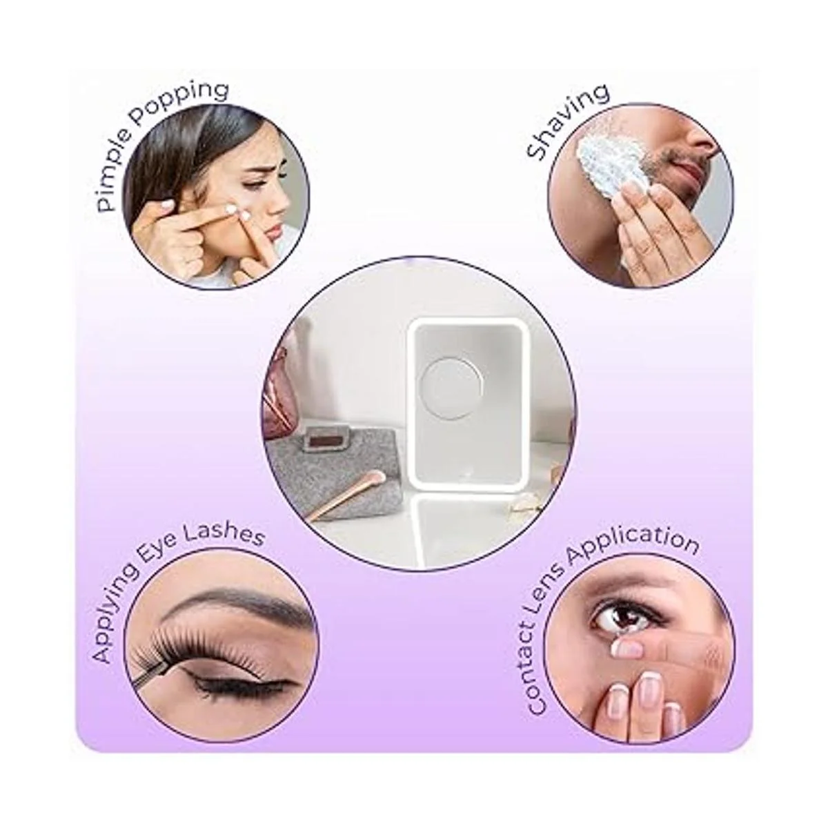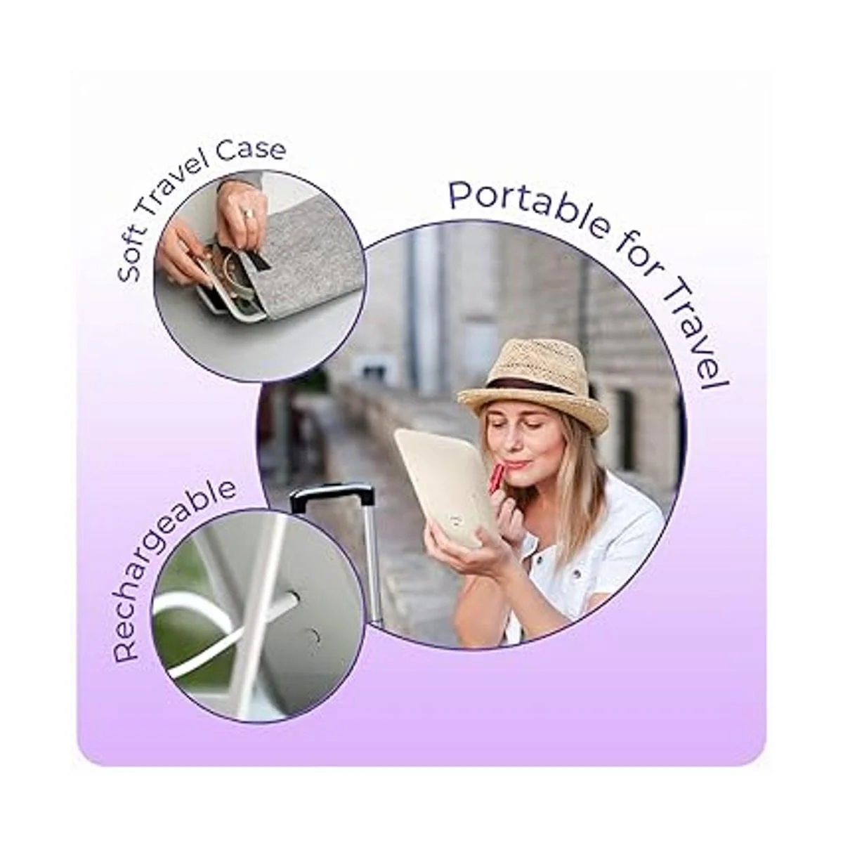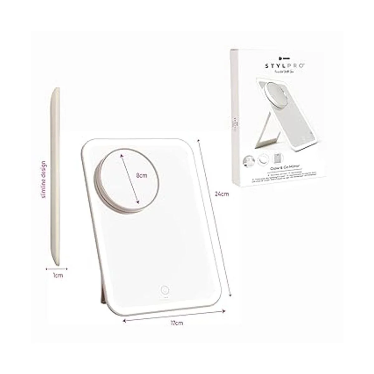 Con iluminación LED regulable, un espejo de aumento magnético y móvil de 10x, carga USB y una funda de lujo de viaje suave, el espejo STYLPRO Glow and Go fácilmente portátil es perfecto para todas tus necesidades de belleza, ya sea de viaje o para uso en casa cuando no tienes un tocador a mano.