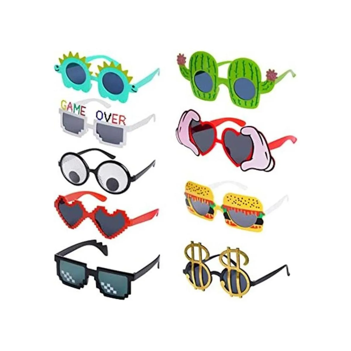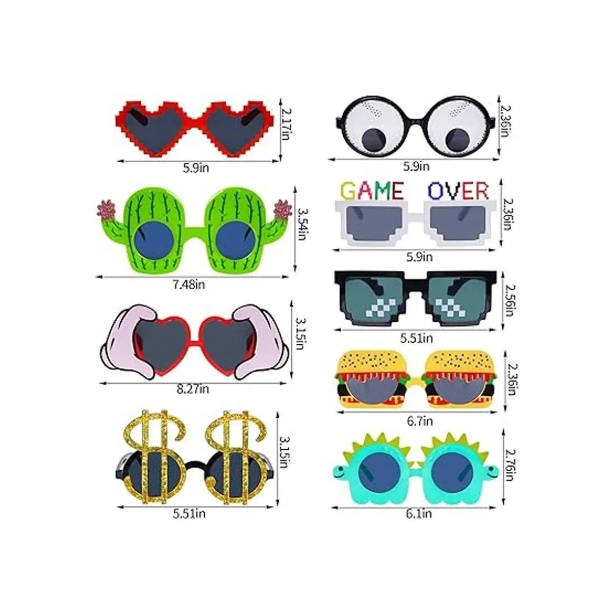 El paquete incluye: 9 gafas hawaianas en total, hay diferentes estilos de gafas de sol para decoraciones de fiesta Luau. Incluye piña, dólares, cactus, Game Over, manos sosteniendo el corazón, corazón de amor rojo, globo ocular, pequeño dinosaurio, hamburguesa y gafas de sol de mosaico negro.