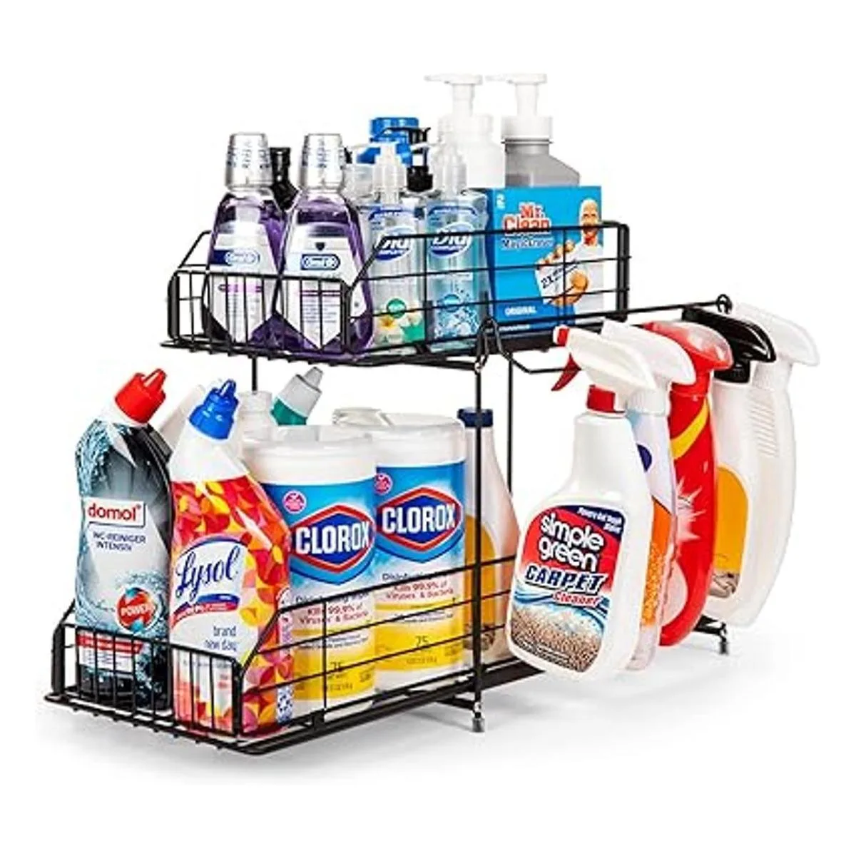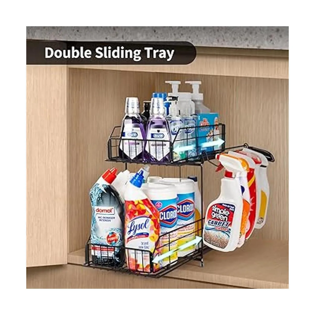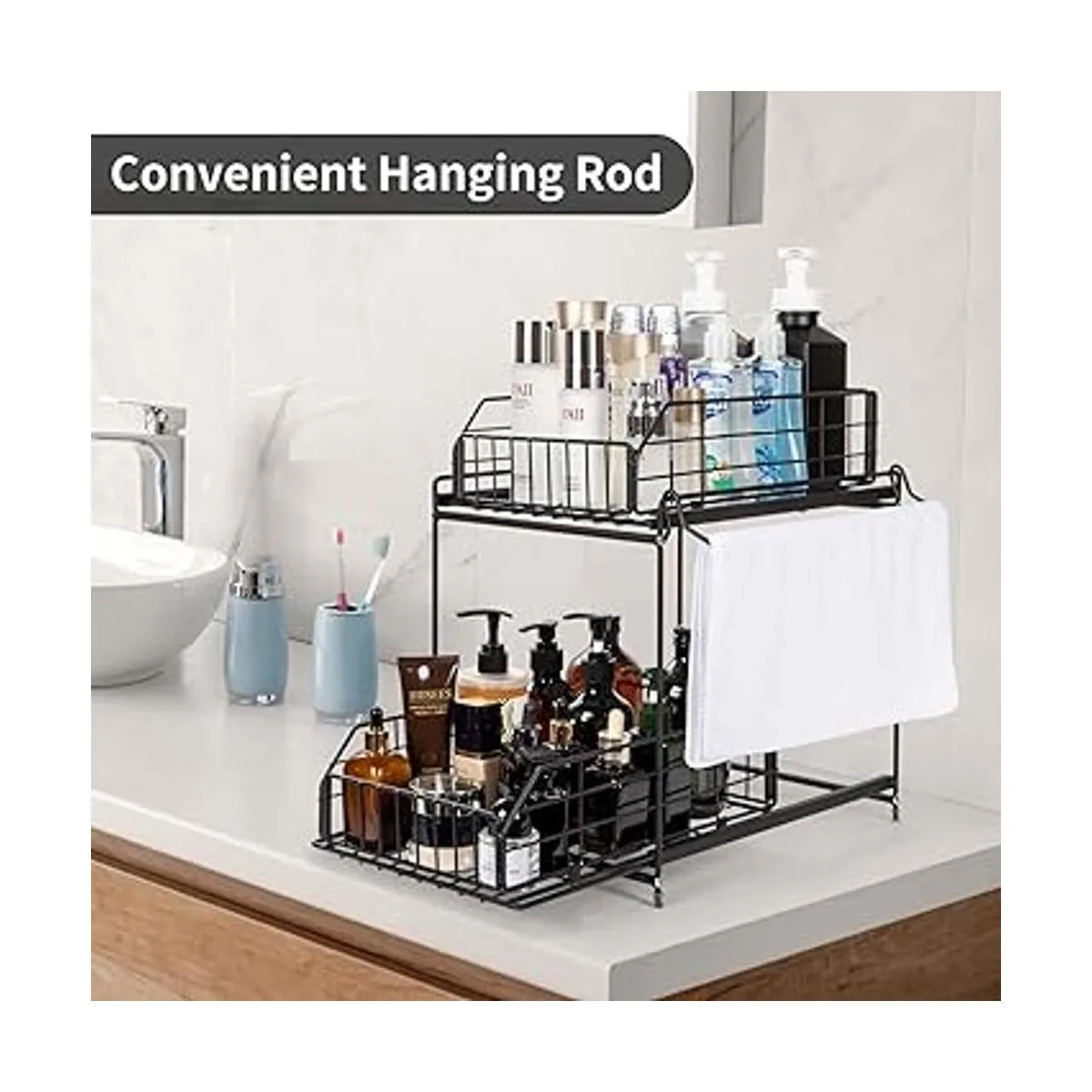 SUEH DESIGN Organizador para debajo del fregadero, organizador de gabinete extraíble de 2 niveles con riel colgante para cocina, baño, estante de almacenamiento