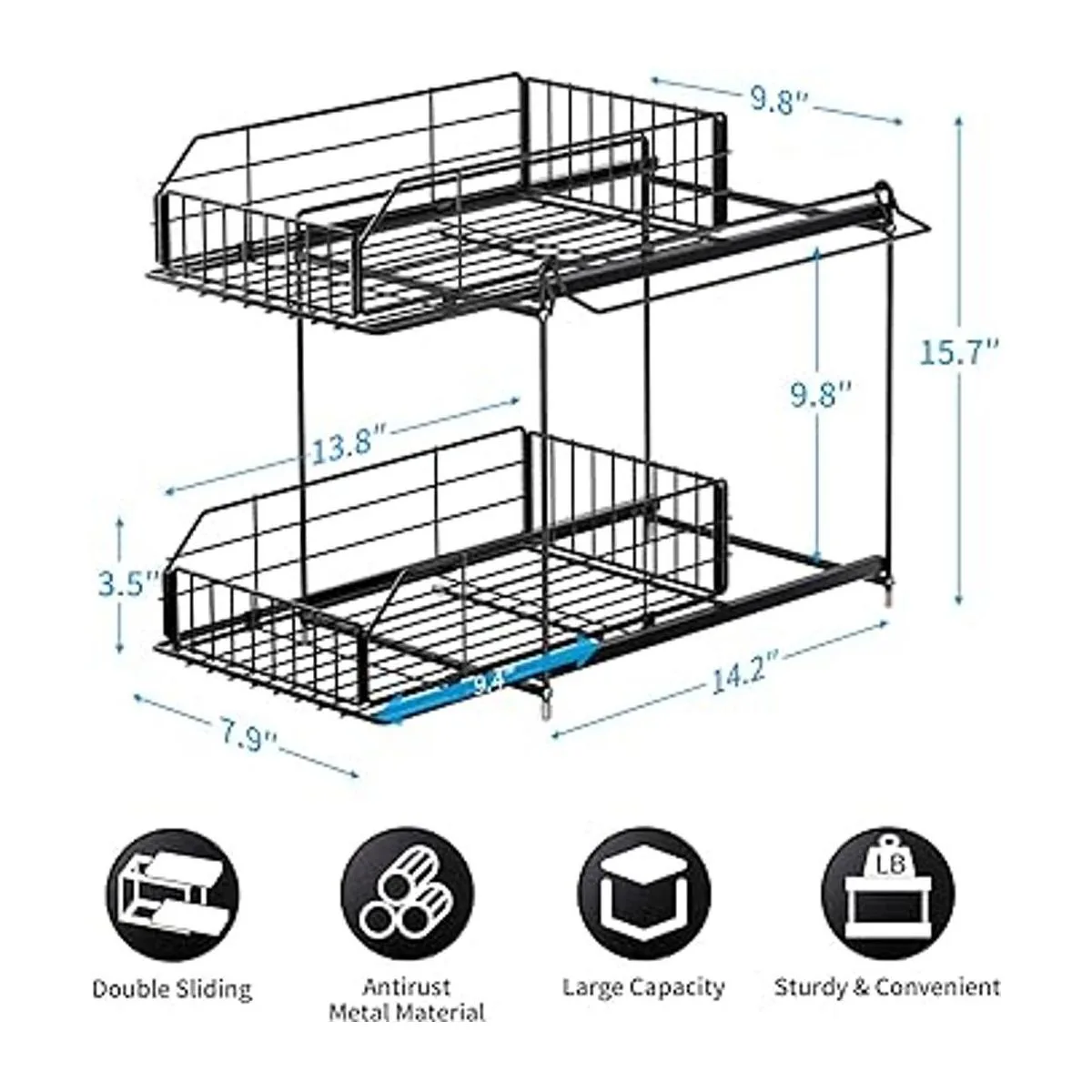 Bonito ahorro de espacio: añadir un organizador debajo del fregadero es la mejor manera de maximizar tu espacio de almacenamiento. Mide 14.2 x 15.7 x 9.8 pulgadas, el almacenamiento debajo del fregadero ofrece un montón de espacio en ambos niveles, especialmente los cajones inferiores pueden contener una botella de tamaño completo de limpiador de hasta 9.8 pulgadas, lo que será tu opción ideal para aprovechar al máximo tu espacio debajo del fregadero.