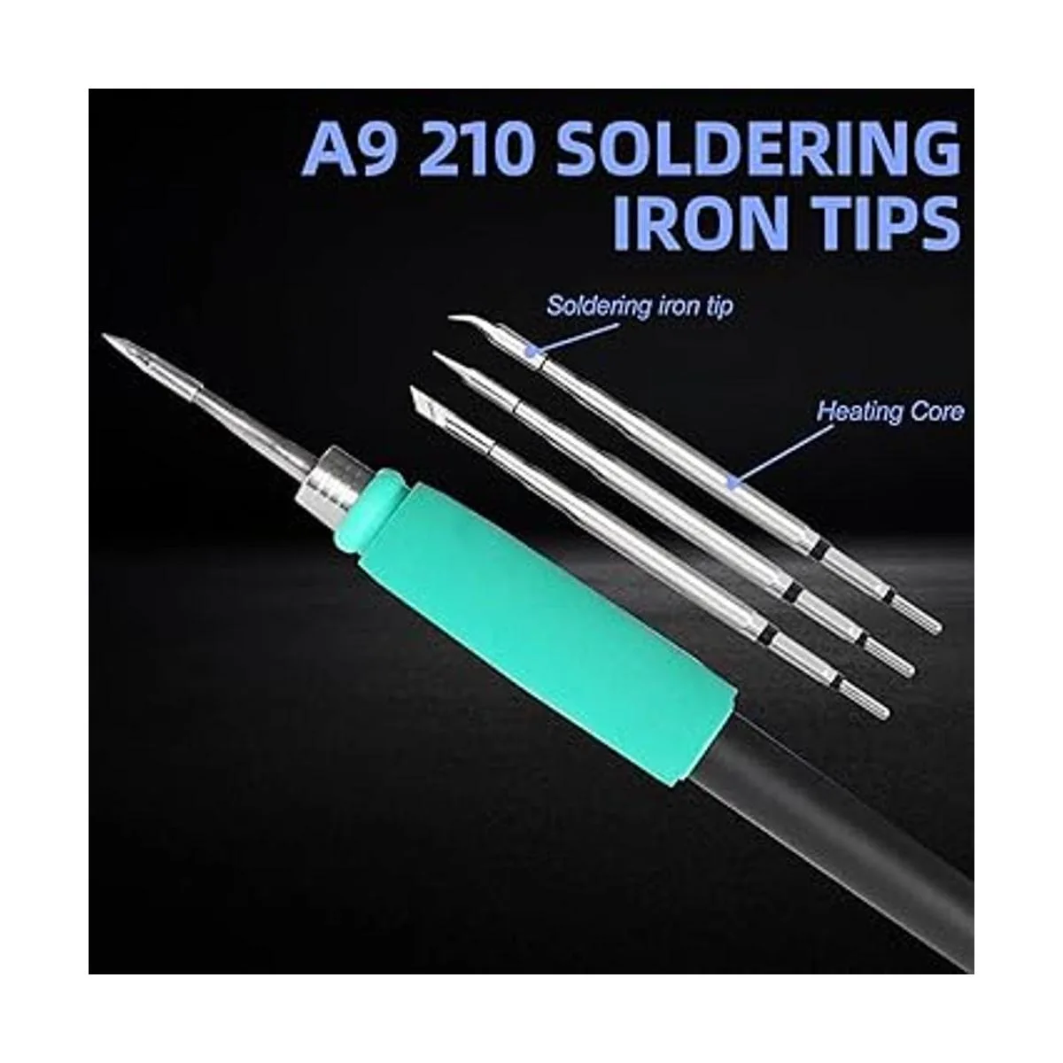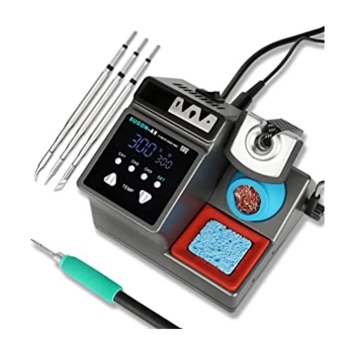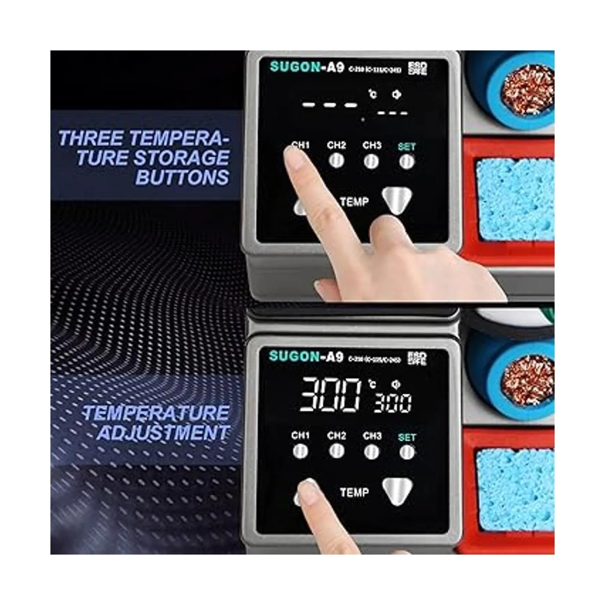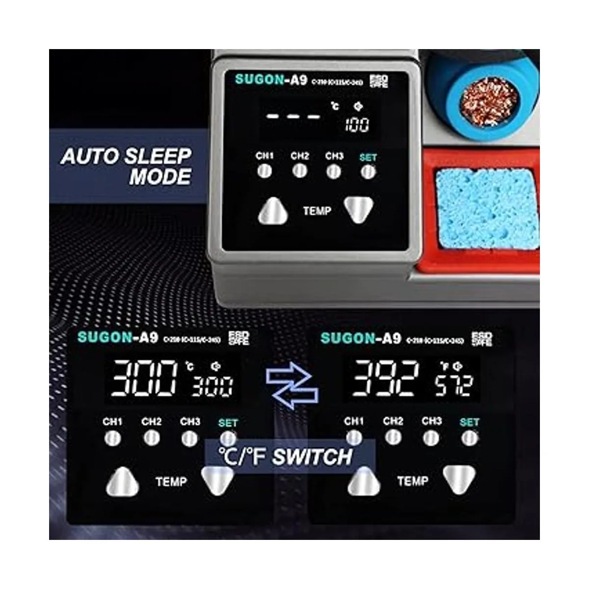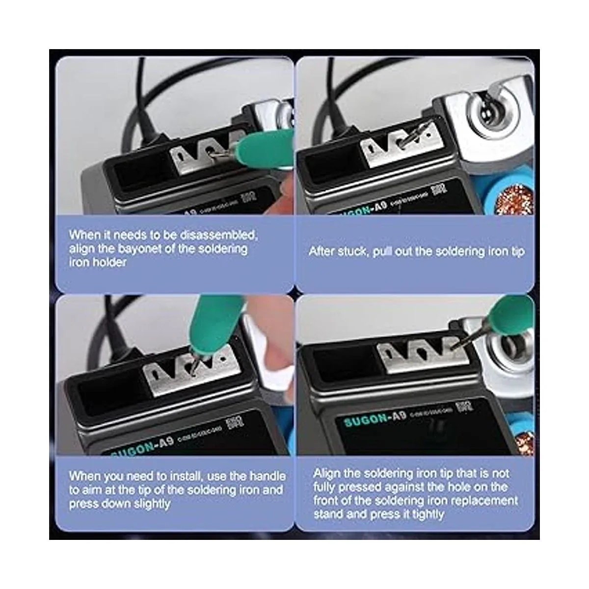 SUGON Estación de soldadura de precisión A9, calentamiento rápido a 716 F en 2 segundos, kit de estación de soldadura de 120 W con 6 puntas de soldador, 3 temperaturas preestablecidas, 212842 , , estante de repuesto para soldador