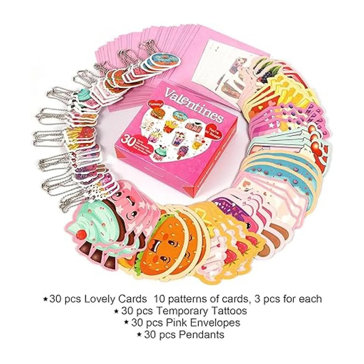 SUKKI Tarjetas de San Valentín para niños, 30 juegos con sobres, colgantes, regalos y tatuajes temporales, tarjetas de intercambio de felicitación perfectas para compañeros de clase, regalos de fiesta para niños y niñas
