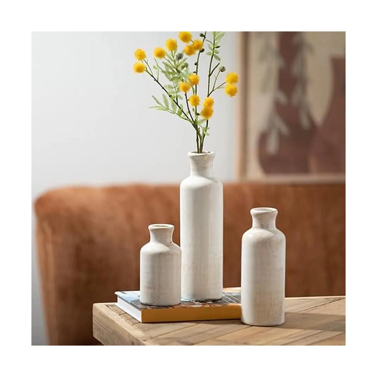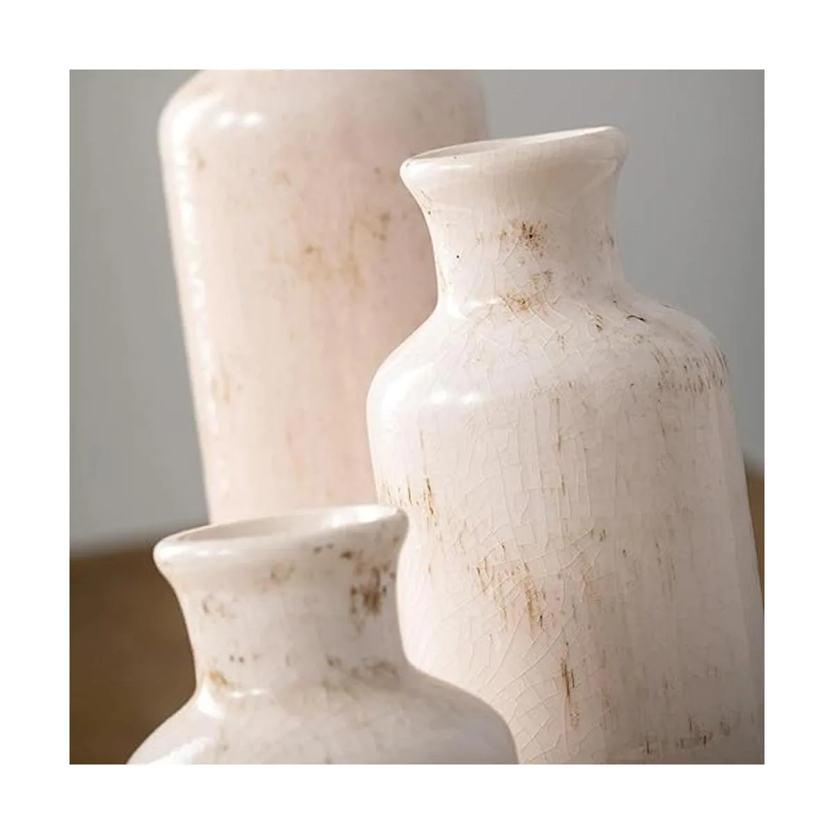 Este juego de tres pequeños jarrones de cerámica blanca envejecidos funciona como el conjunto de acento perfecto para cualquier tema de diseño, e incluso son ideales para regalar