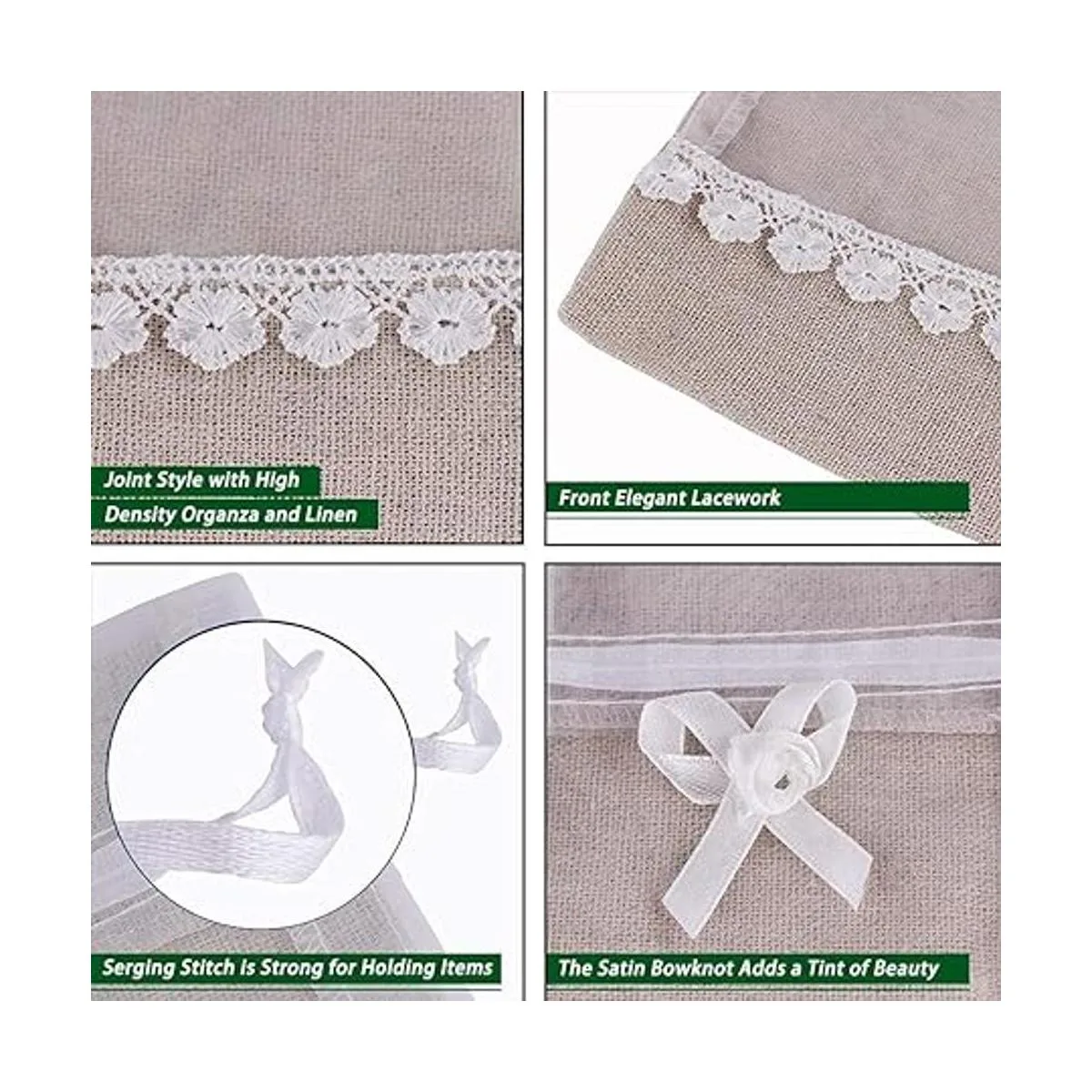 Las bolsas están hechas de lino ecológico con organza, encaje y lazo de alta calidad