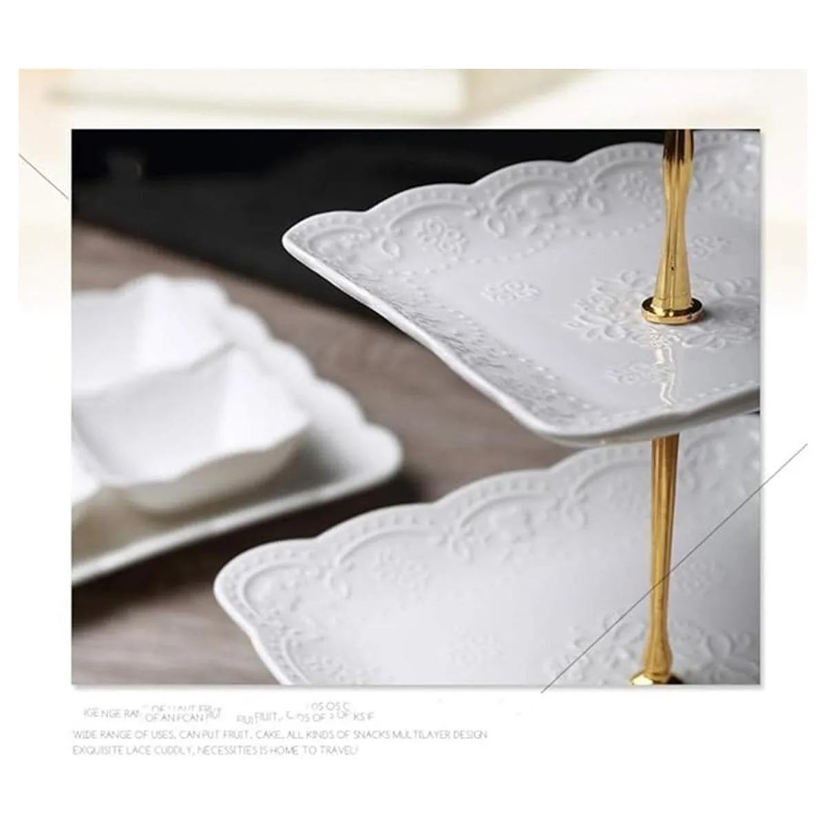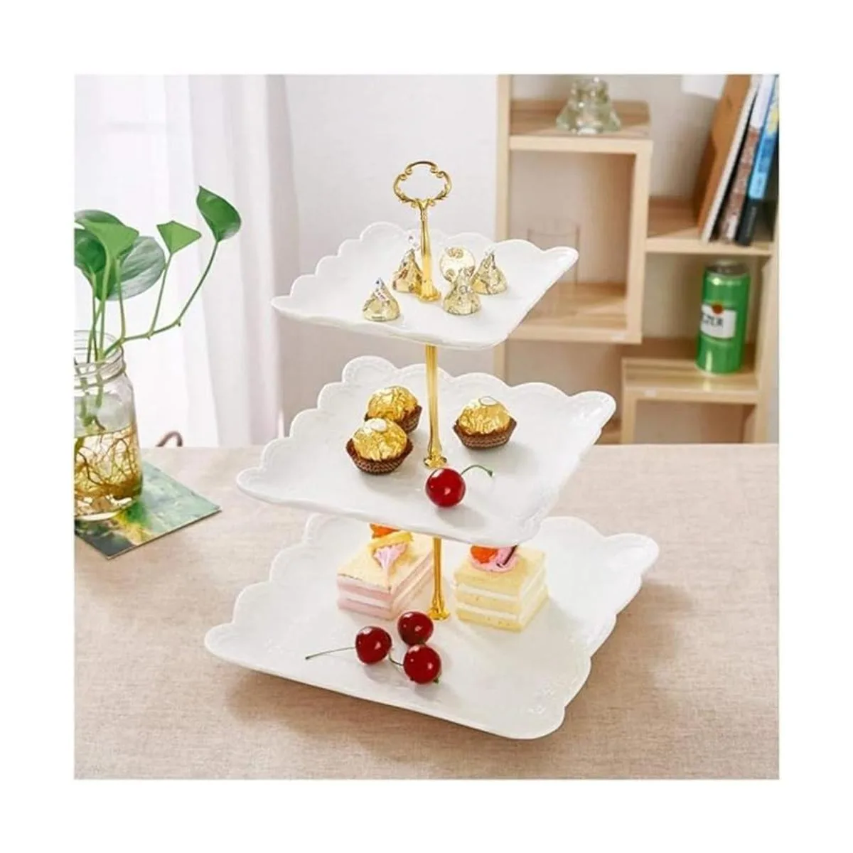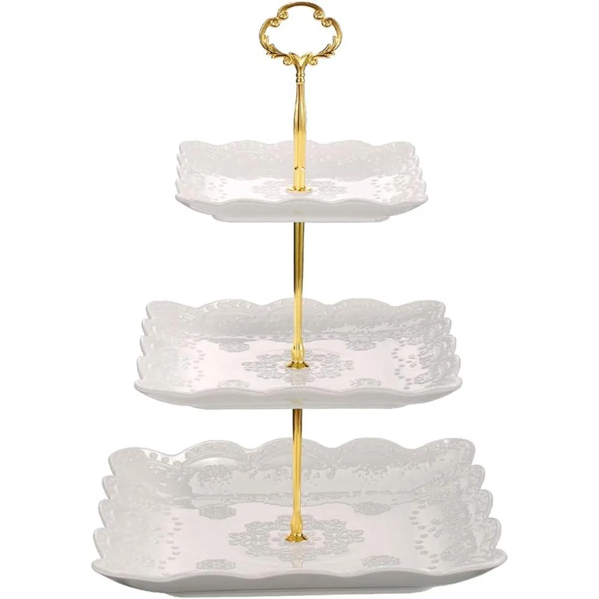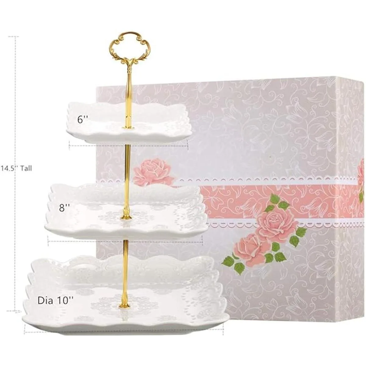 Sumerflos Soporte para cupcakes de porcelana de 3 niveles, soporte para pasteles de servir escalonados, soporte cuadrado blanco en relieve, bandeja para servir pasteles de bodas, fiestas