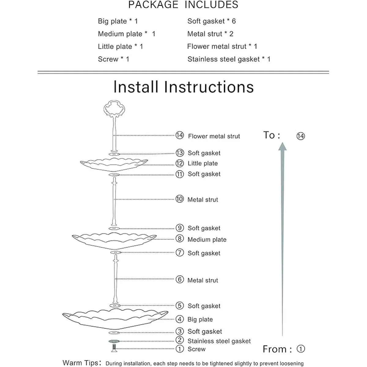 Dimensiones: altura total: 14.5 pulgadas. Diámetro de los platos: nivel inferior: 10 pulgadas, nivel medio: 8 pulgadas, nivel superior: 6 pulgadas. El tamaño adecuado para mostrar tus creaciones culinarias.