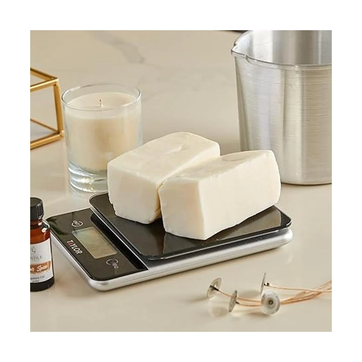 Versatilidad: este producto funciona muy bien con todo tipo de recipientes, tarros, mechas e incluso se puede combinar con otras ceras. Se envía en bloques, no en perlas ni bolitas. Es suave y fácil de cortar y se siente casi como mantequilla casera para derretir fácilmente. Parafina de soja, para uso en velas aromáticas. No funciona en ceras. Añade siempre la etiqueta de advertencia a una vela.