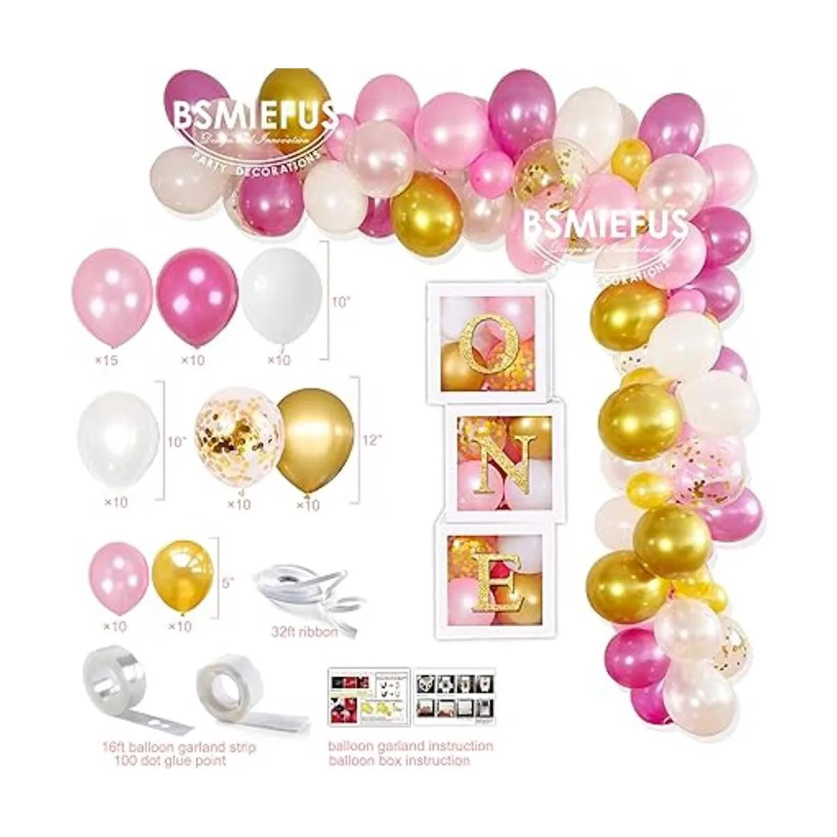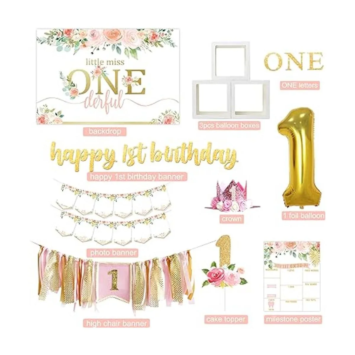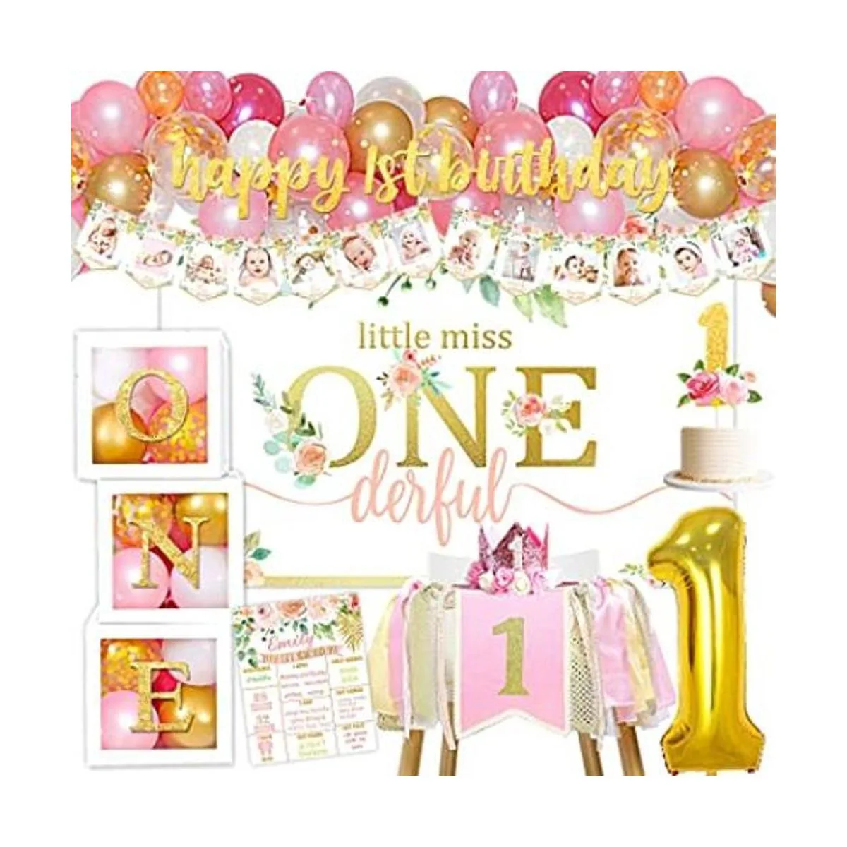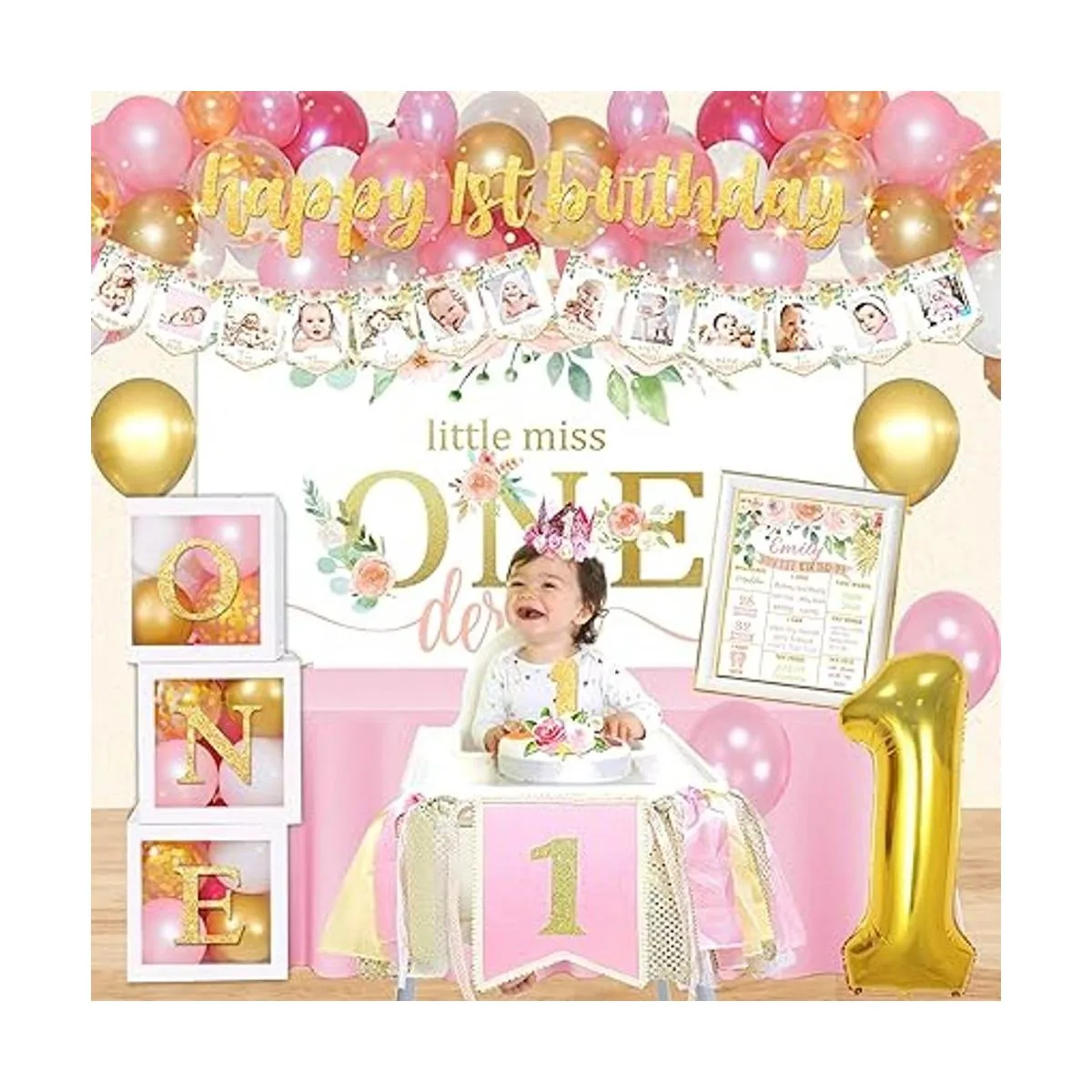 Juego de decoración para niña de primer cumpleaños. El paquete incluye: fondo de primer cumpleaños, 3 cajas de globos de primer cumpleaños, pancarta de feliz primer cumpleaños, pancarta de fotos de recién nacido12 meses, corona de primer cumpleaños, pancarta de silla alta, una decoración de pastel, carteles de hito de primer cumpleaños, globo de aluminio número 1, 85 globos de látex, tira de guirnalda de globos, calcomanías de 100 puntos, cinta de globos, instrucciones idioma español no garantizado.