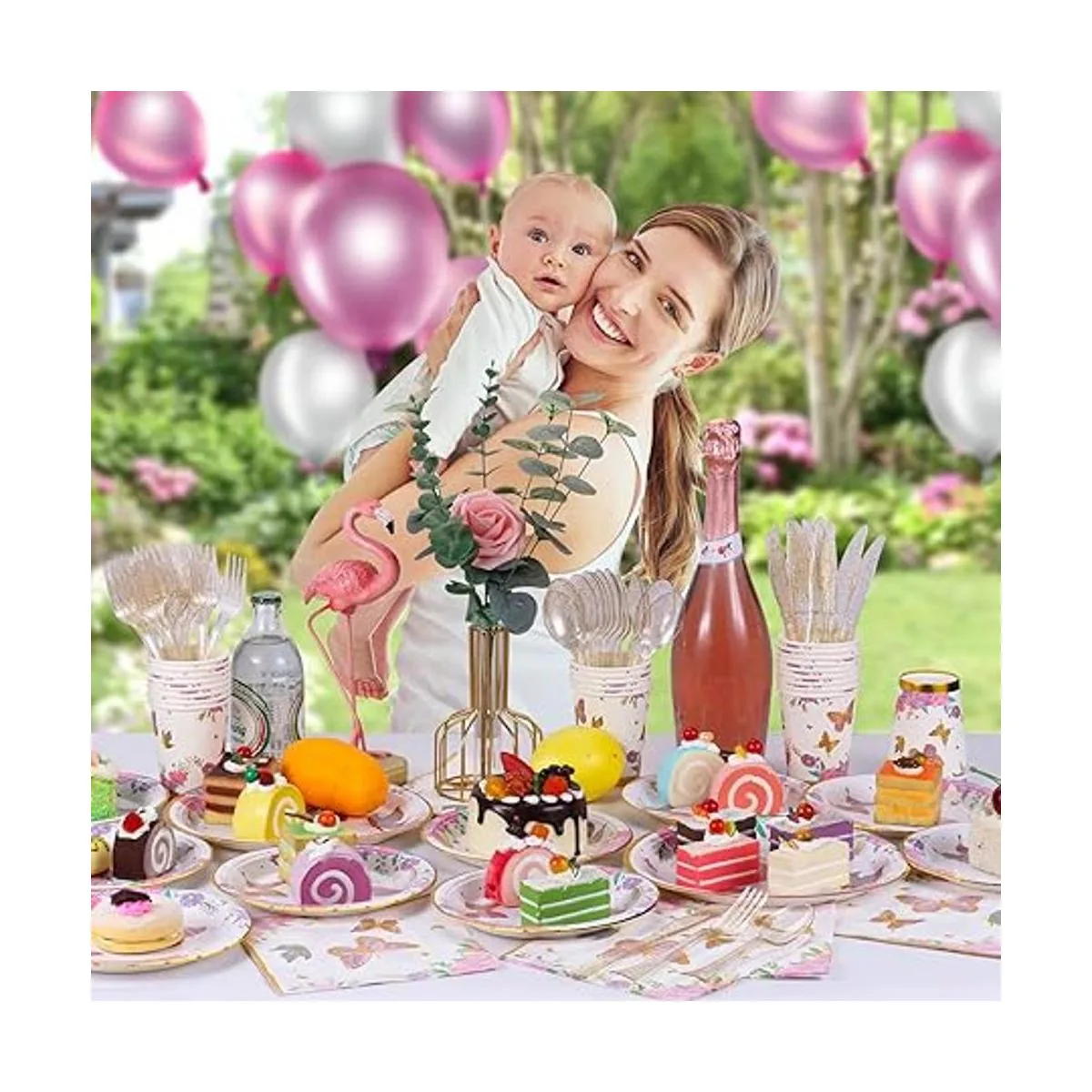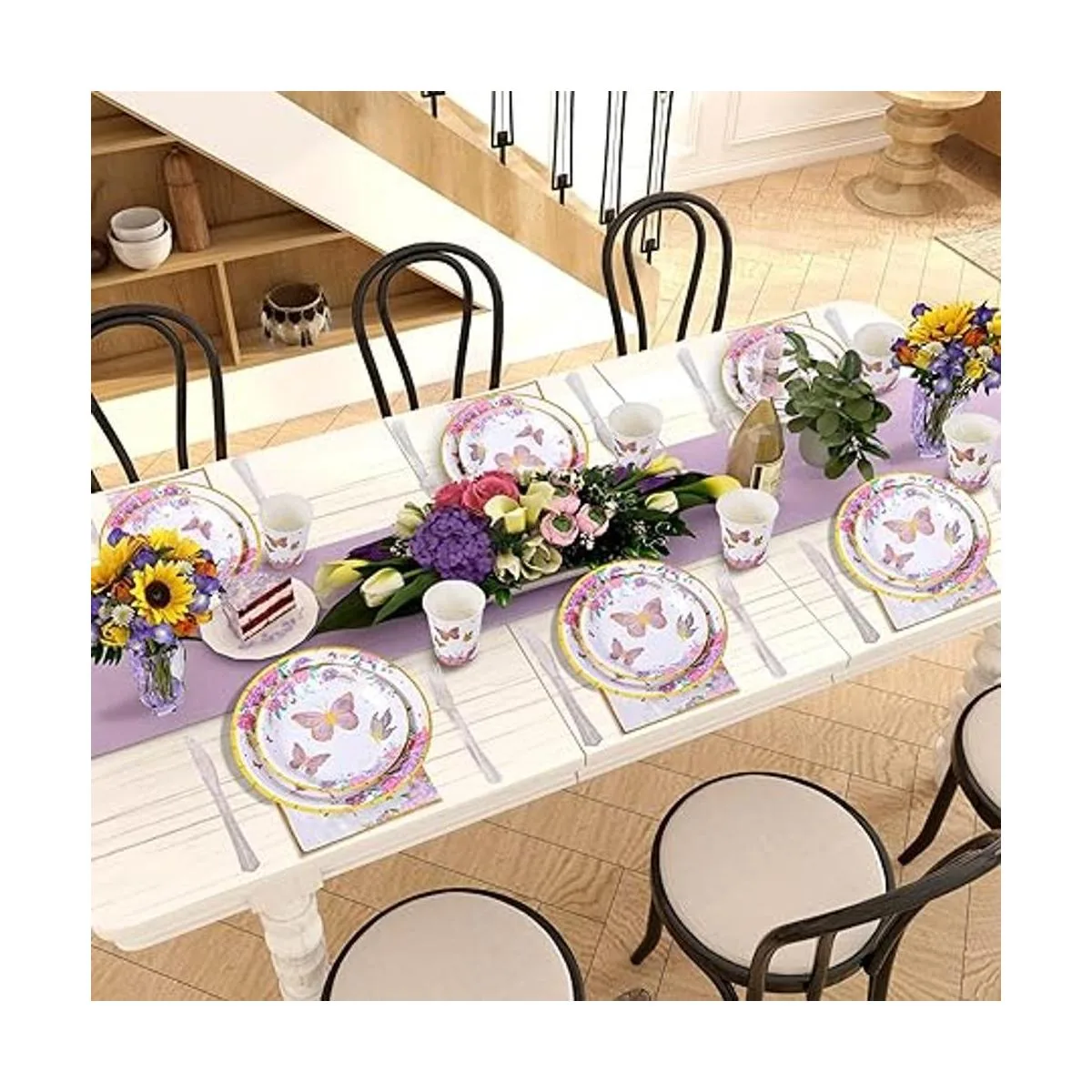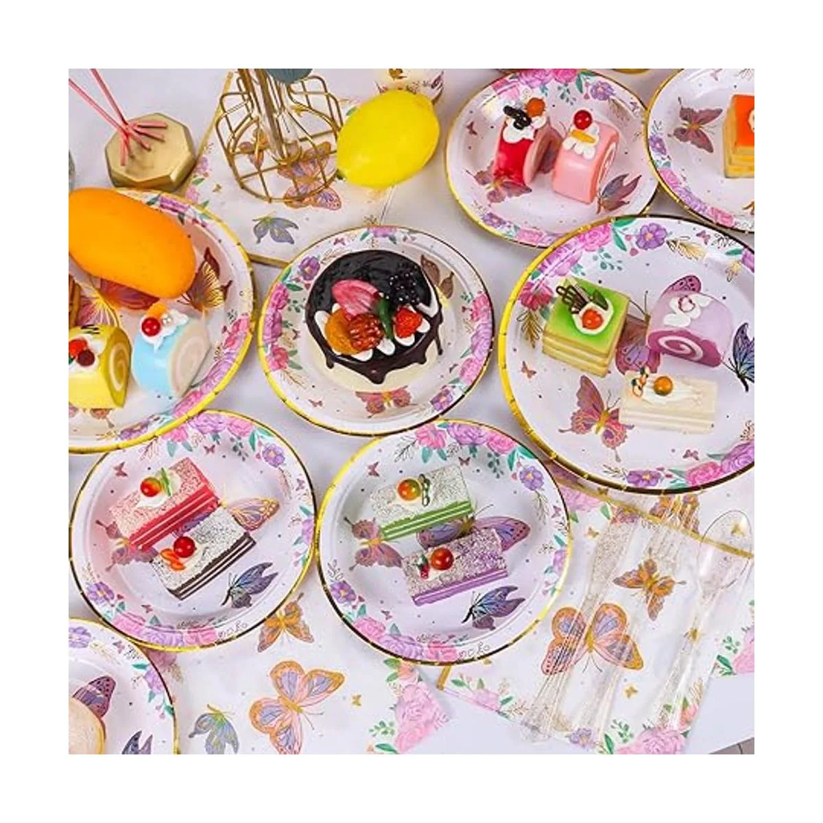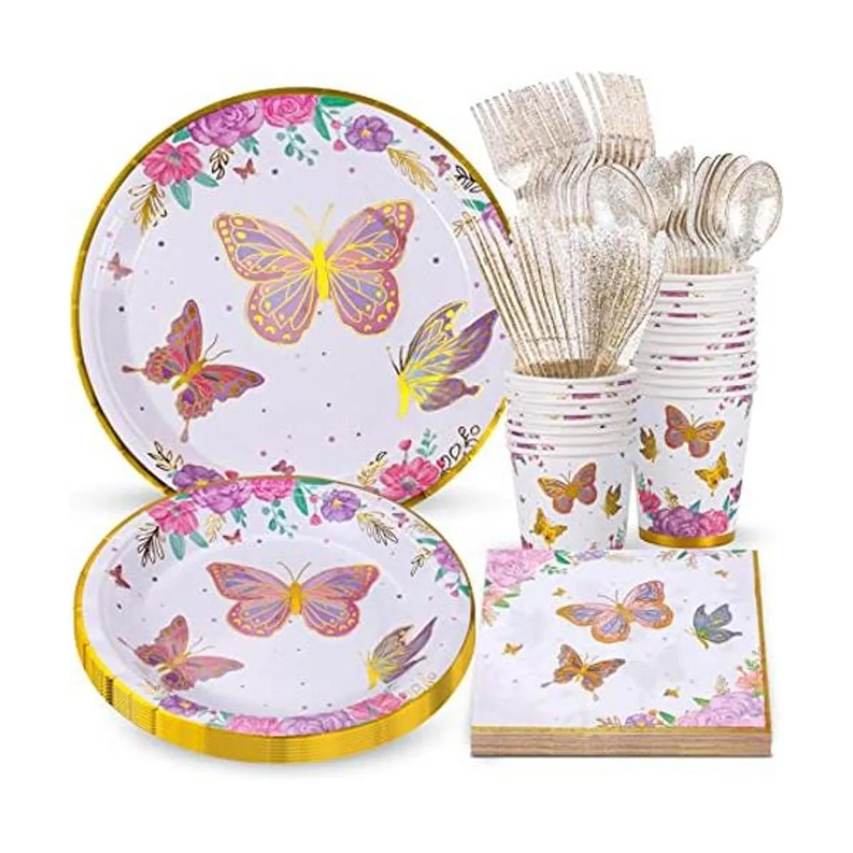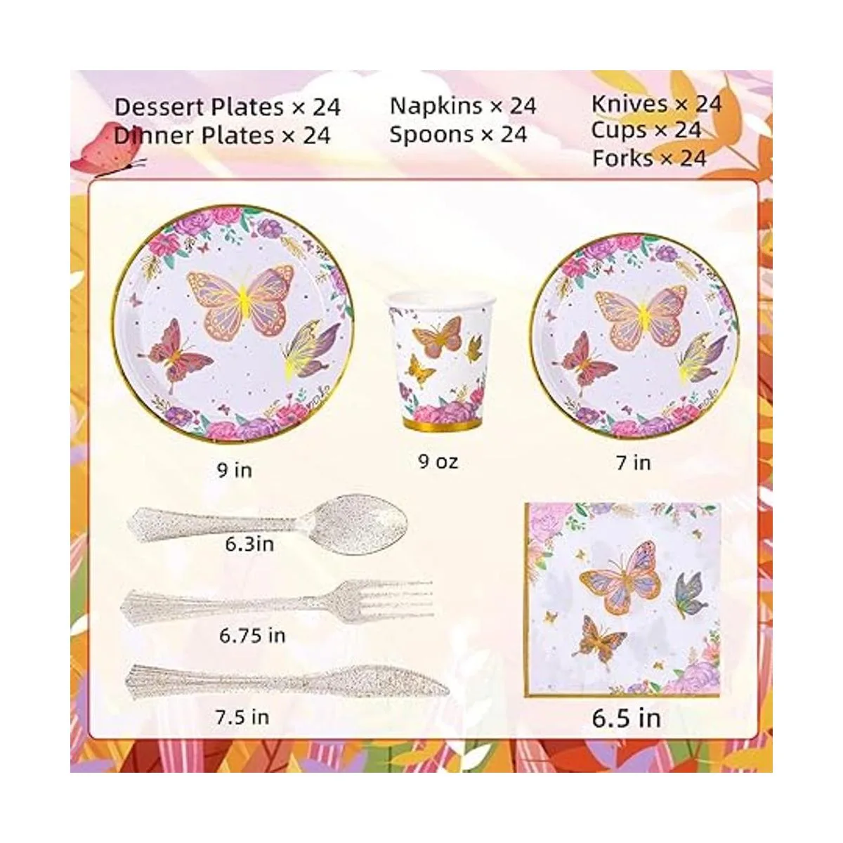 Suministros de fiesta de cumpleaños de mariposa, platos de fiesta de mariposa, vasos, servilletas y cubiertos, decoraciones de fiesta de mariposa para baby shower, cumpleaños, fiestas temáticas de hadas de mariposa sirven 24