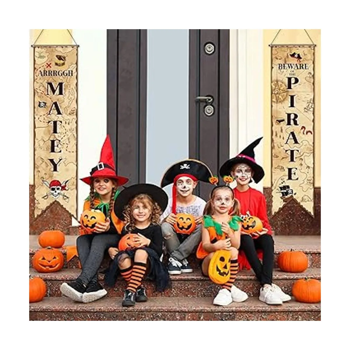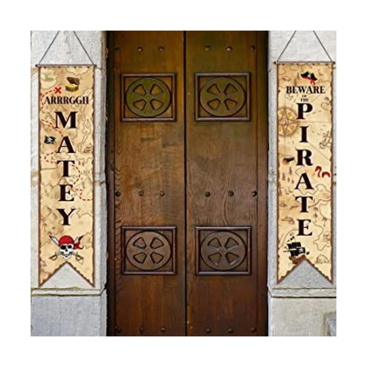Juego de pancarta de decoración pirata: recibirás 2 pancartas de puerta pirata, que miden aproximadamente 12 x 72 pulgadas, una bonita pancarta pirata para cumpleaños para satisfacer las decoraciones de fiesta pirata