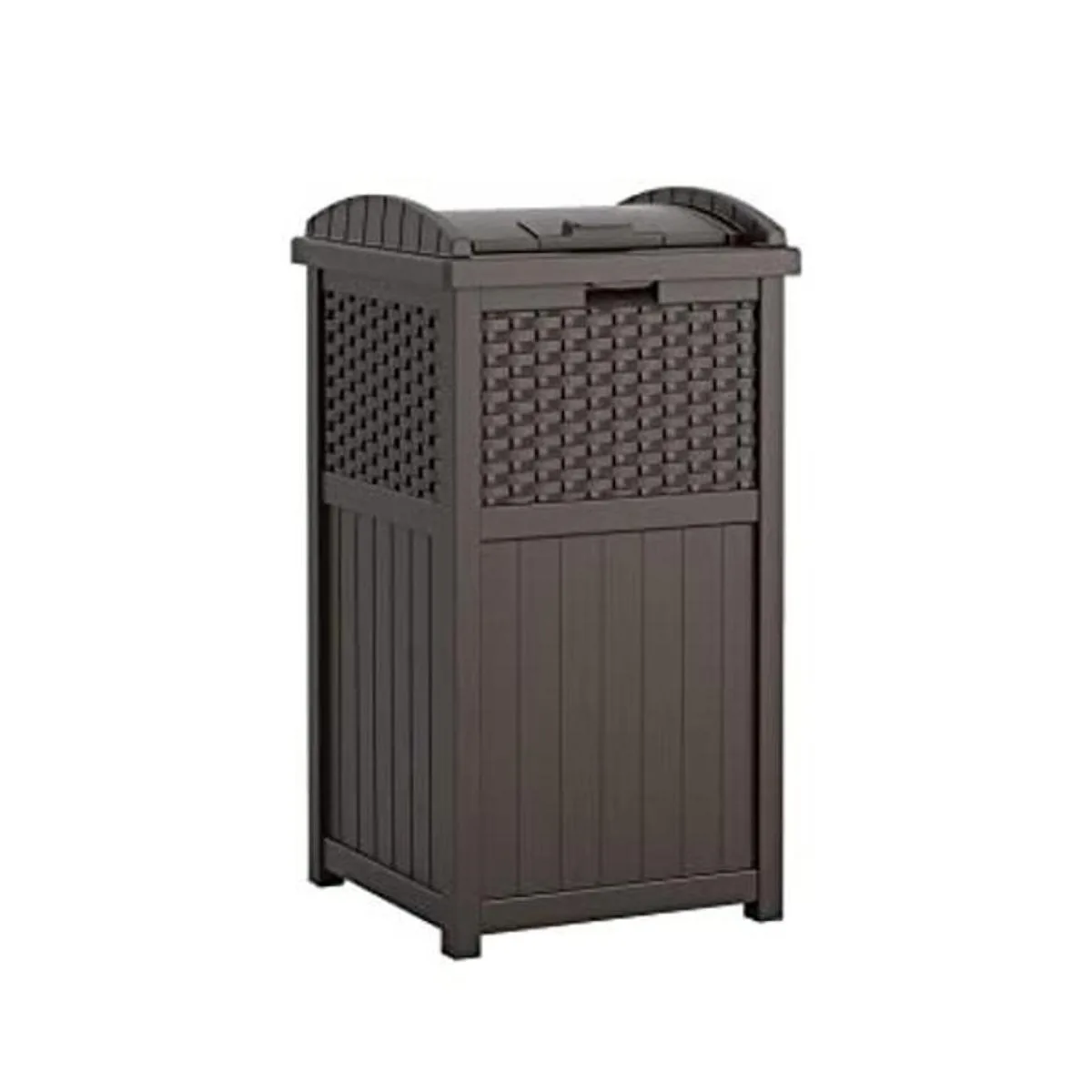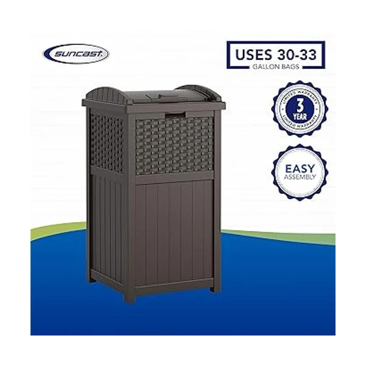Suncast Cubo de basura de resina para exteriores de 33 galones con tapa, uso en patio trasero, terraza o patio, 33 galones, color marrón