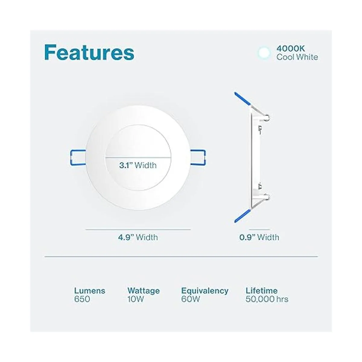Sunco Lighting Luces de techo empotrables LED ultra finas de 4 pulgadas, delgadas 4000 K, blanco frío, regulables 10 W 60 W, 650 LM, borde suave con clasificación húmeda, oblea sin lata fina con caja de conexiones, paquete de 4 unidades Energy Star