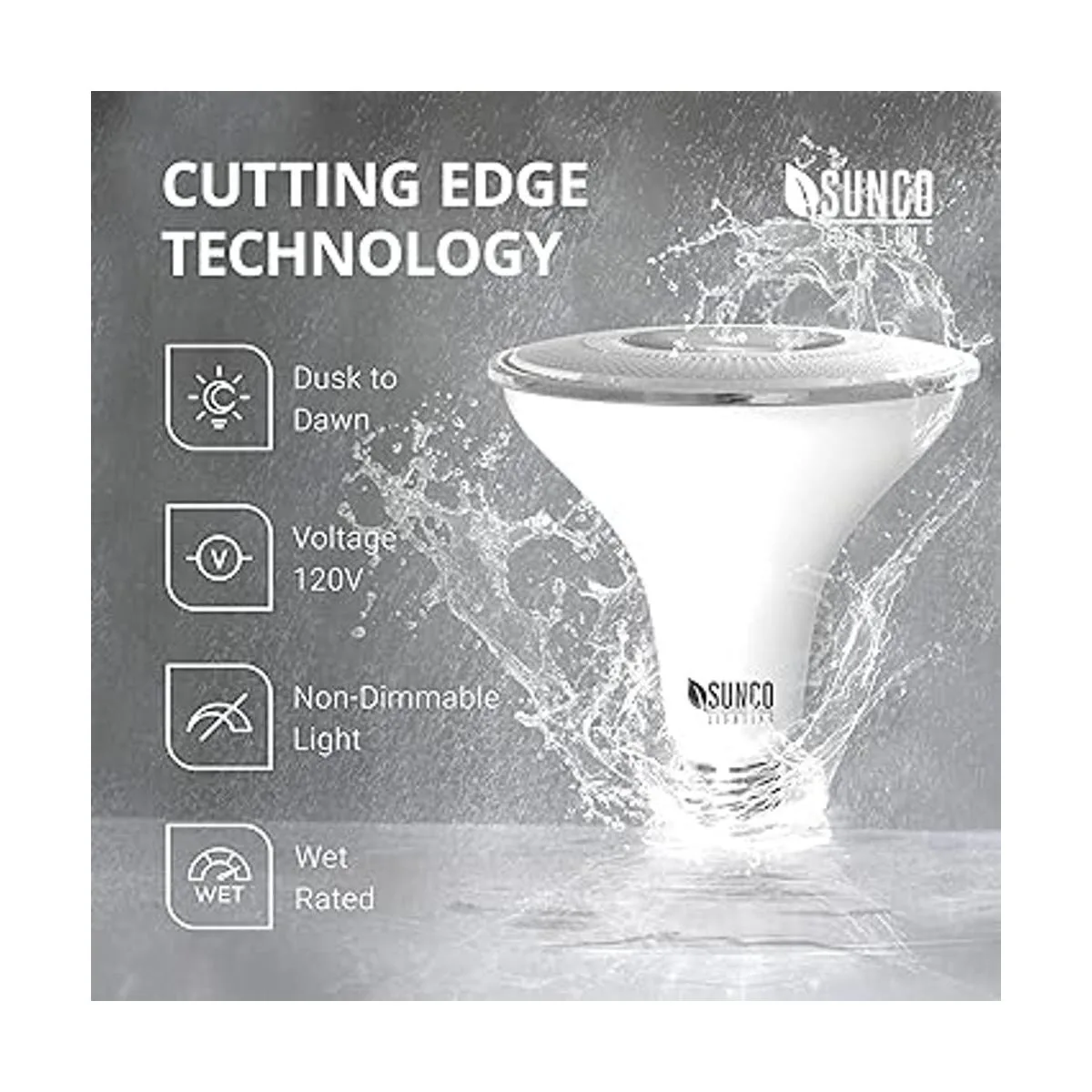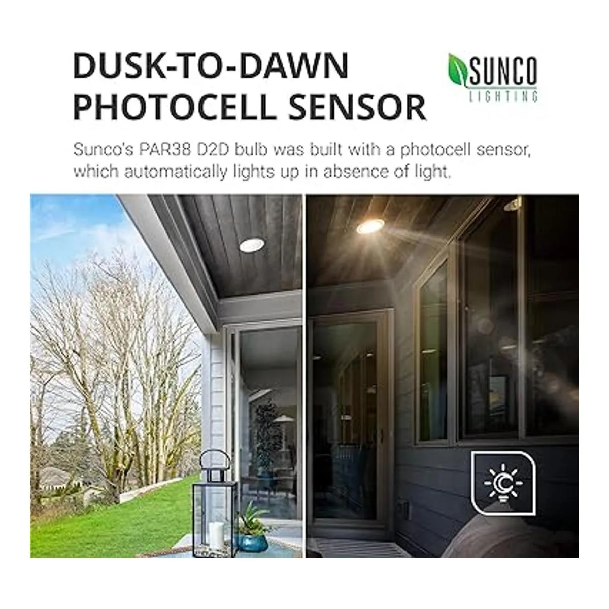 Anochecer hasta el amanecer: la bombilla LED PAR38 de Sunco se enciende automáticamente al atardecer. Deja la alimentación encendida para activar el sensor. El sensor de fotocélula detecta niveles de luz para actuar como una luz nocturna automatizada. Nota: la bombilla no es regulable.