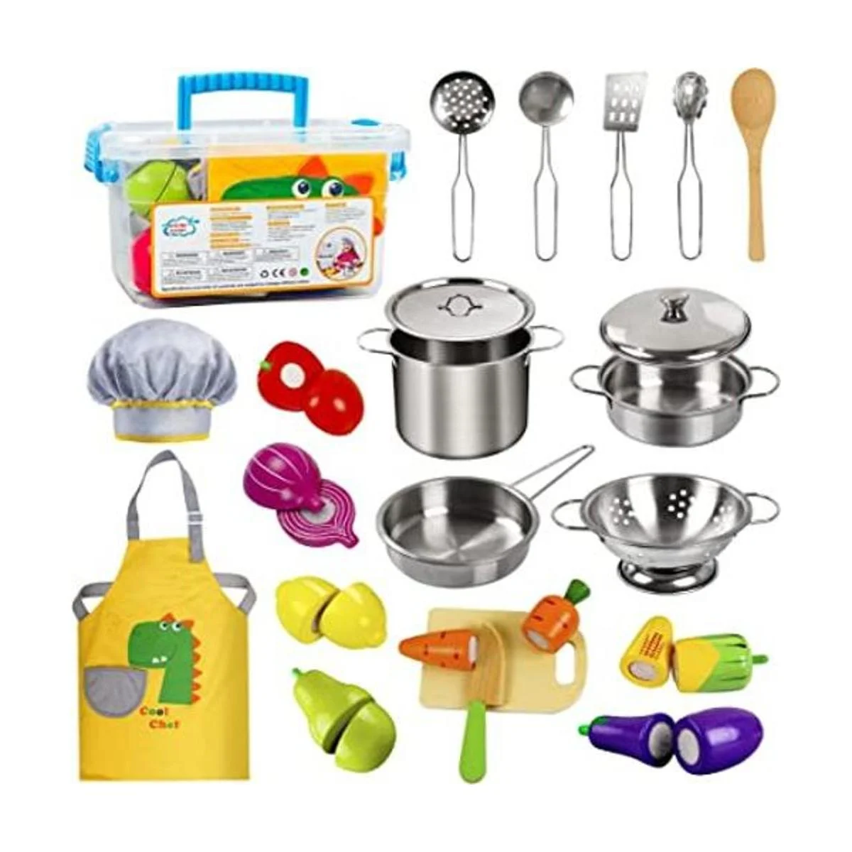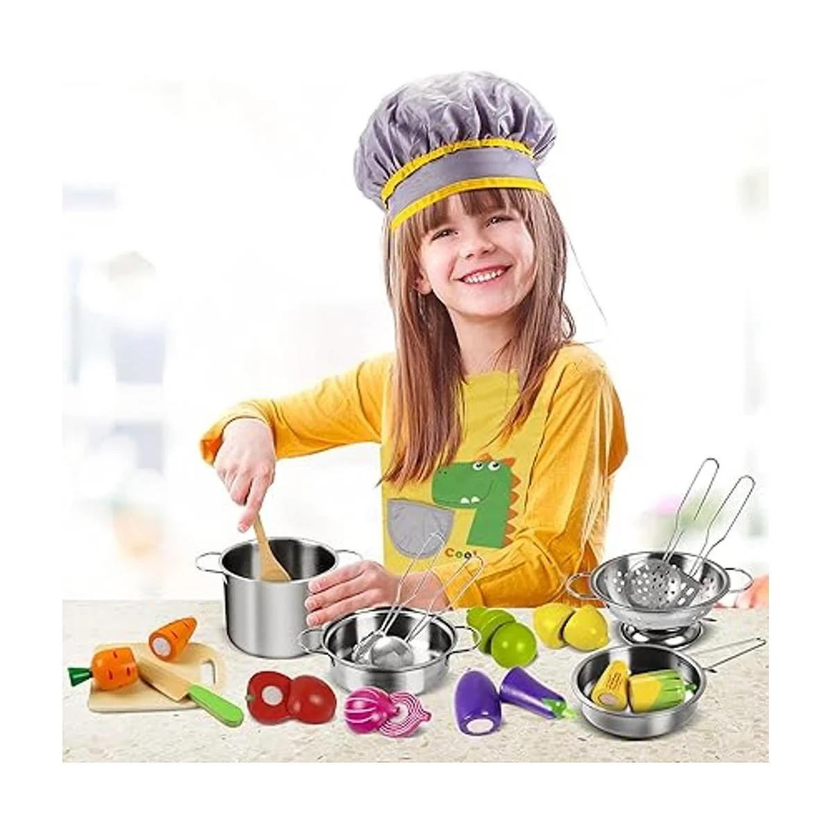 Sundaymot Accesorios de cocina de juego, juego de cocina de madera, juego de cocina con utensilios de cocina de acero inoxidable, ollas y sartenes, delantal, sombrero de chef, juego de cocina de corte de alimentos para niñas y niños
