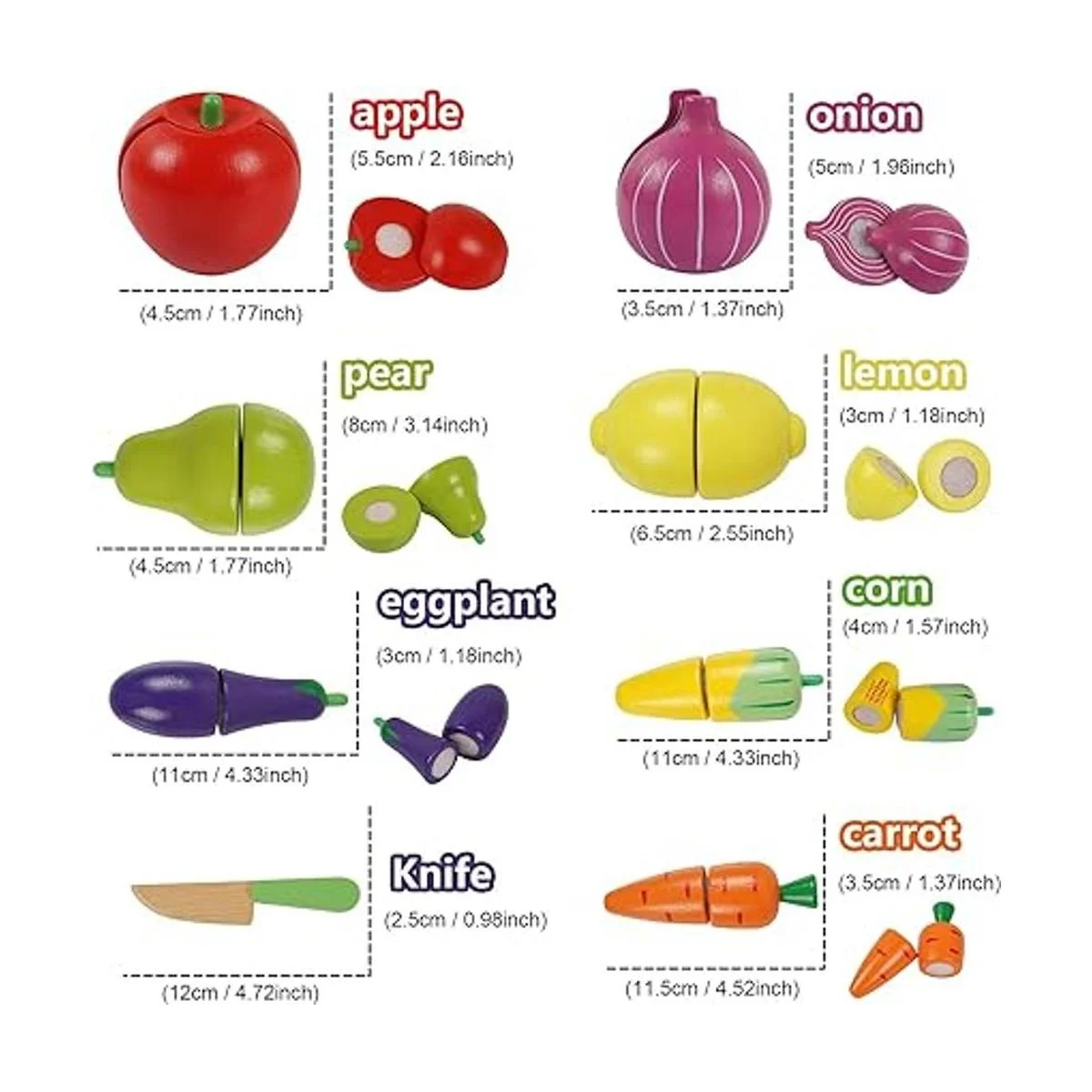 Juego de cocina de juego: 23 piezas en total, incluyendo 10 ollas y sartenes de acero inoxidable, 1 vajilla de madera, 7 frutas y verduras de madera, 1 cuchillo, 1 tabla de cortar, 1 sombrero, 1 delantal, 1 almacenamiento bo. Las verduras y frutas de madera son más texturizadas y duraderas que las hechas de plástico, natural y saludable.