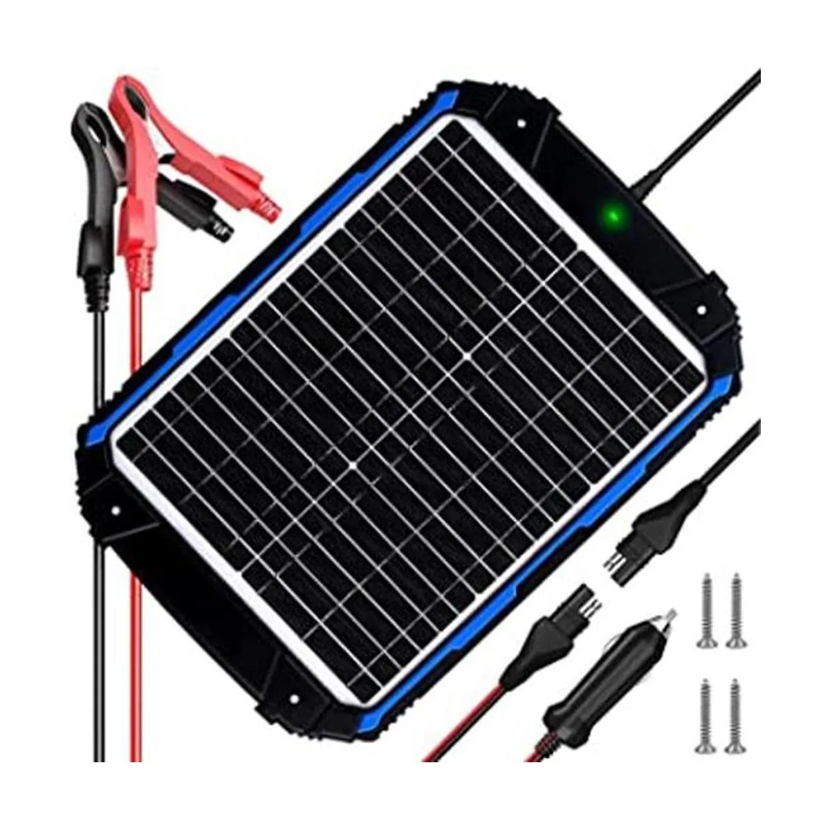 Portátil y carga en cualquier lugar Cargador solar ligero y portátil. Transfiere el sol a electricidad, carga y mantiene diferentes baterías de 12 V como inundaciones, gel, AGM, SLA, VRLA, batería de iones de litio de RV, coche, barco, marina, automoción, motos de nieve, etc. en todas las estaciones. Pendiente de patente estadounidense