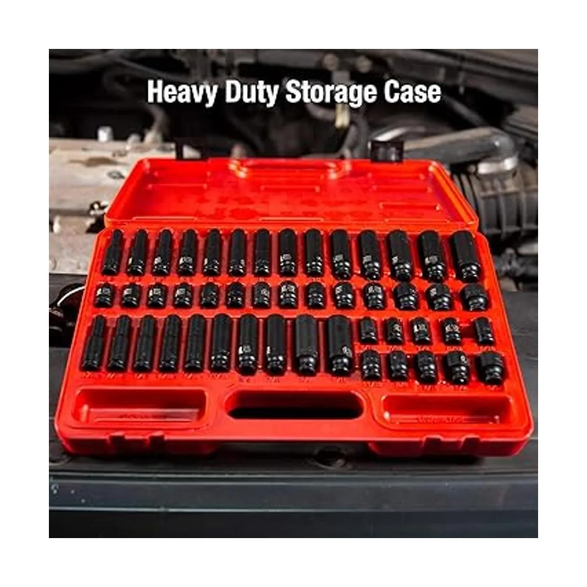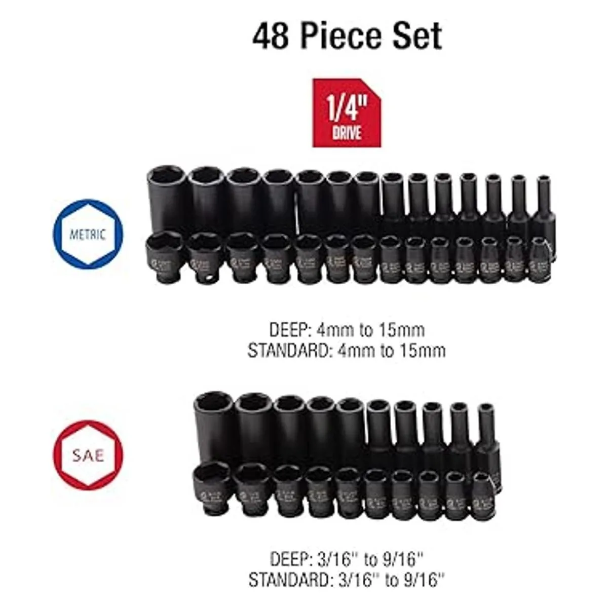 Sunex 1848 Juego de llaves de impacto SAE y métricas, de 14 pulgada, pulgadasmétricas, estándarde profundidad, 6 puntas, CrMo, 316 pulgadas 916 pulgadas, 4 mm 15 mm, 48 piezas