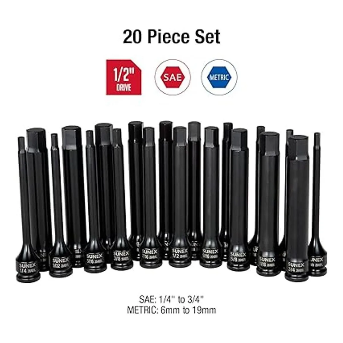 Sunex 2637L, pulgadas, 6 pulgadas de largo, juego de destornilladores hexagonales de impacto maestro de 6 pulgadas de largo, 20 piezas, SAEmétrico, 14 pulgadas 34 pulgadas, 0.236 in 0.748 in, acero CrMo, caja de almacenamiento resistente, cumple con las normas ANSI